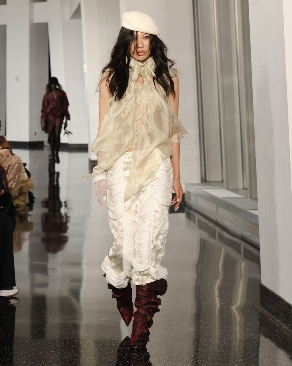 "SS26 explores concealment, distortion, and the act of peeling back layers," Shui says in her show notes. And she meant it. When I last spoke with Shui, she told me how her collections often pull from her own story—growing up in a Chinese household in Rome before moving to the U.S.—and how designing feels like a way to be seen on her own terms. This season, you could feel the shift from last season’s bolero ties-meets-Qipao collars moment; the silhouettes were less literal, the message more personal.