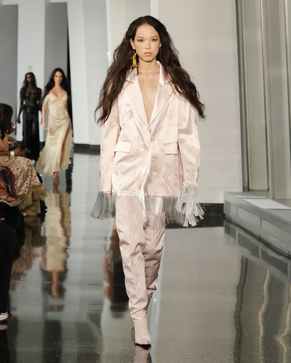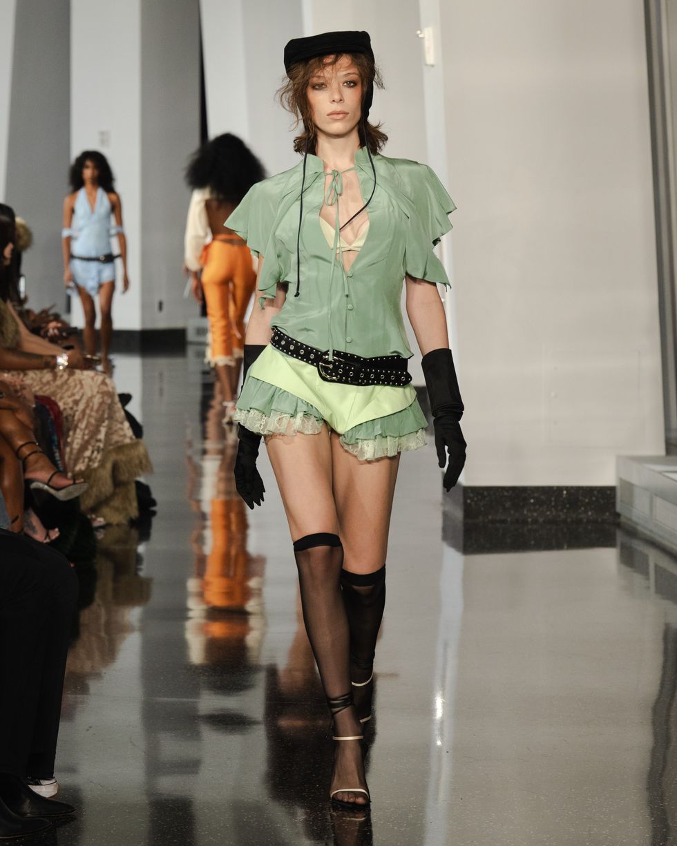 Yes, there was plenty of Shui's signature lace-up corsets and birthday party-worthy mini-dresses. But look past the snakeskin boots and thumping bass and flashing strobes, and you'll find a collection that's surprisingly soft and nuanced, full of unexpected moments, like swingy fringe dripping off black lace woven over a olive-green dress, or silk chiffon tops and dresses where the fabric seems to float, not drape, unfurling like soft wisps of fog. The clothes felt like they were stretching, peeling back, breaking free, and at its heart, this collection seemed to celebrate the joy that comes when you no longer have to hide.