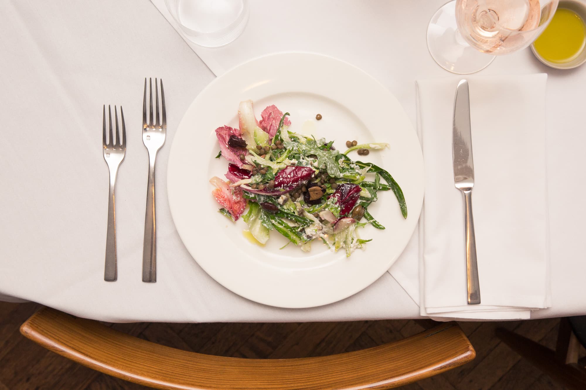 6. To serve, tumble some lentils onto the plate, and top with some of the dressed leaves. Sprinkle some more lentils through the salad, ensuring each plate has a little of each leaf. Finish with some good-quality olive oil.