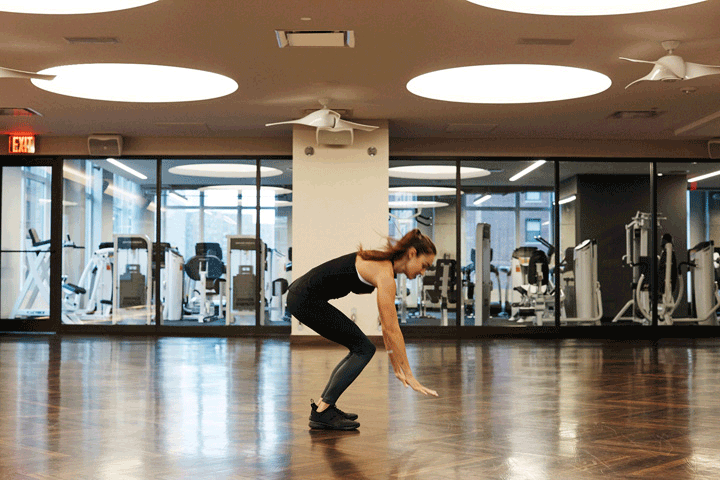 Use this exercise to really drive your heart rate up. As you improve, try to move even faster while maintaining control. Standing tall with your feet just outside your hips, drop to the floor as smoothly as possible into a push-up with your hands under your shoulders and your elbows tight to your body—use your abs to control your body so you don