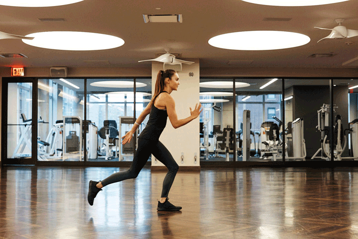 The Single-Leg Knee Drive is a great move to light a fire in your legs and help you increase speed and power. Start by standing with your feet hip width apart. Take a long lunge back on one side, and drop your back knee towards the floor, keeping your chest up and back straight. From the base of the lunge, push through your front foot to drive the back knee forward and up into a knee drive position while your front foot hops off the floor. When you land, the same leg steps straight back into the next lunge. Do 15 reps on each side, and be sure to use your arms to get more momentum in this move.
