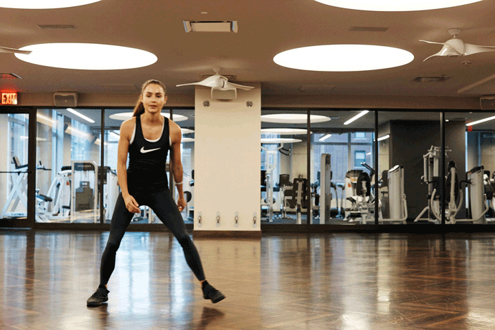 Start in an athletic shuffle position with feet outside hips and a bend in your knees. Keep your chest up and eye gaze forward. Shuffle three steps to the left and touch down with your inside hand, then repeat in the opposite direction. Stay low and move fast; you want to maximize the speed and agility in this move, and get low in the legs to work the inner thighs. Repeat for one minute.