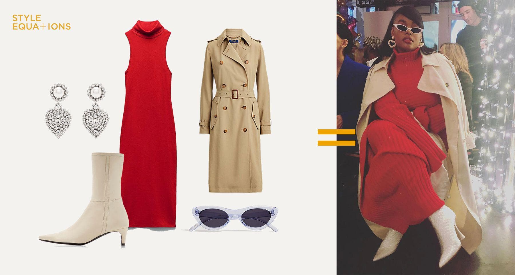Right photo: Courtesy of Instagram/@preciousleexoxoWe love the way Precious Lee tones down the scarlet hue of her dress with neutral layers and accessories. A classic trench will never fail you, but amp up the volume with statement earrings and cat-eye sunglasses.