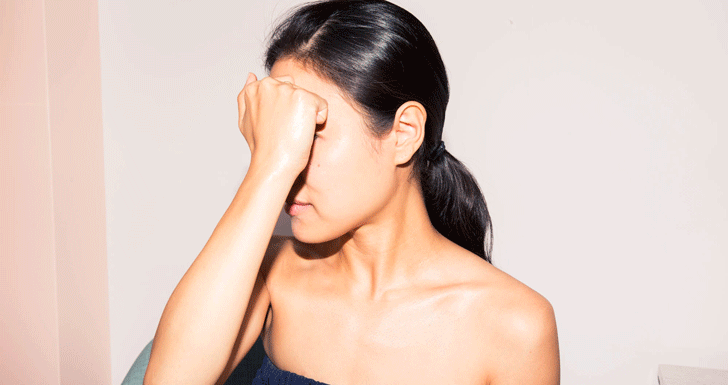 1. “Take your knuckles and rub them across your forehead. Make sure you have lots of product on your hands. This area will be very stimulated, and it will relieve tension. Then vigorously lift the muscle up. Then drain everything by brushing your fingers down your neck.”