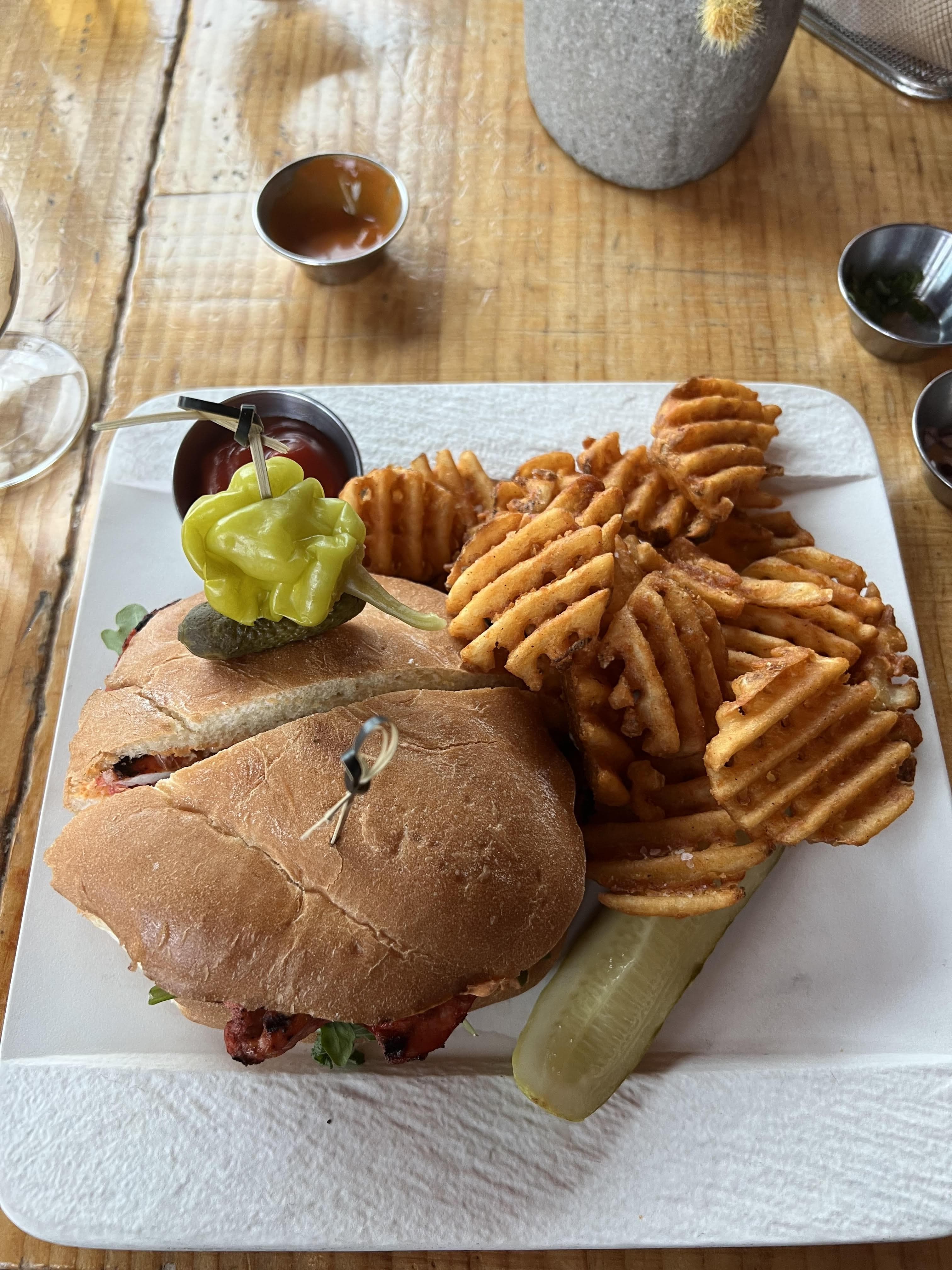 The grilled chicken sandwich with waffle fries.Overlooking the Edgewood golf course, Brooks’ Bar & Deck is a convenient lunch spot. I ordered the beef chili soup, which may or may not have been the best soup I’ve ever had, as well as a grilled chicken sandwich. My partner ordered the chicken wings, which he agreed were A-plus.