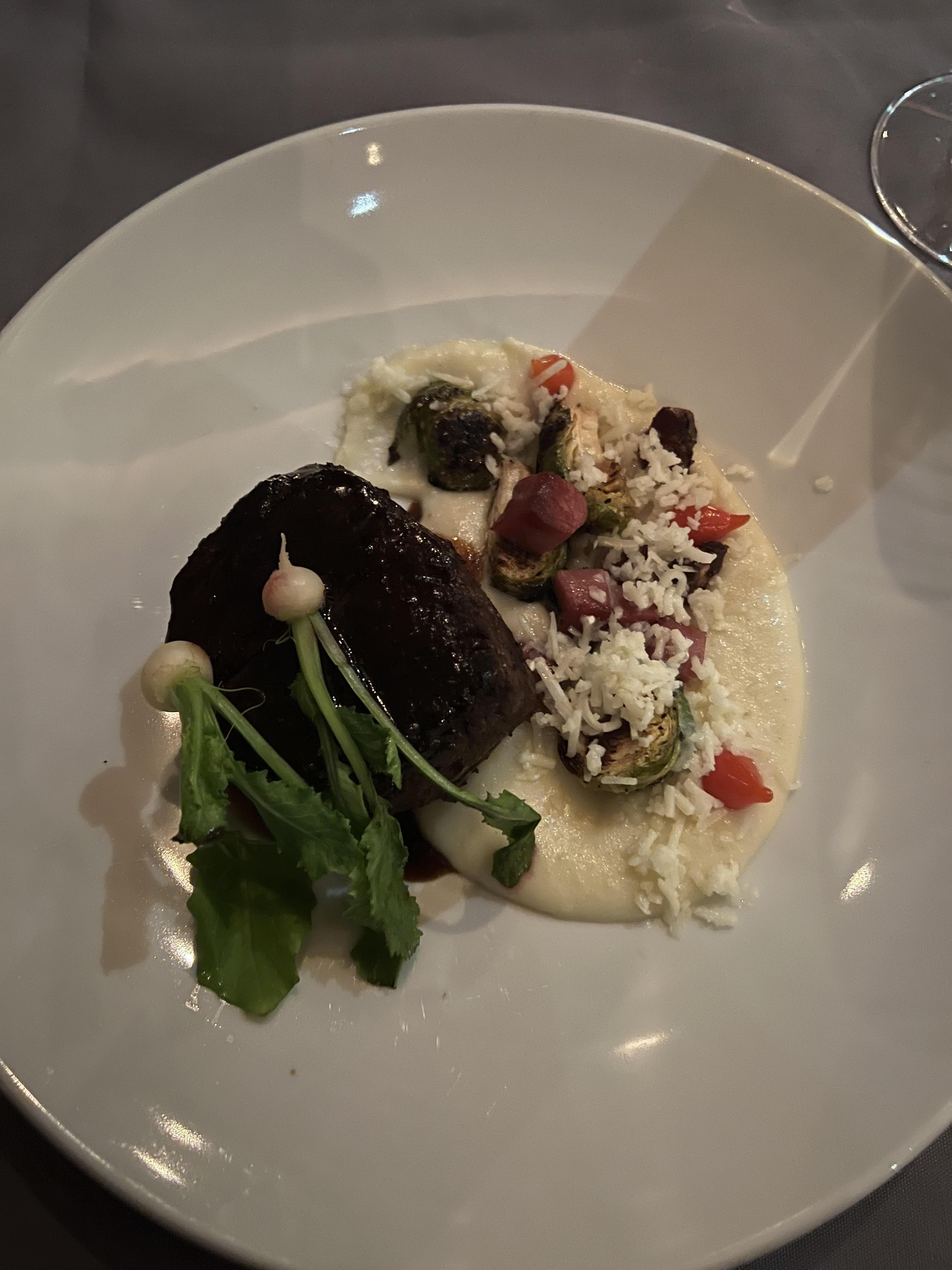 The filet mignon with potato fondutta, piedmontese toma, speck roasted brussels, sweet drop peppers, and rosemary glace.Located directly on the golf course with views of the lake, Edgewood Restaurant is a great spot for a Saturday night meal and the most winter lodge-feeling of the three on-property restaurants. I ordered the filet mignon (no surprise here), while my partner ordered the prime steak duo.