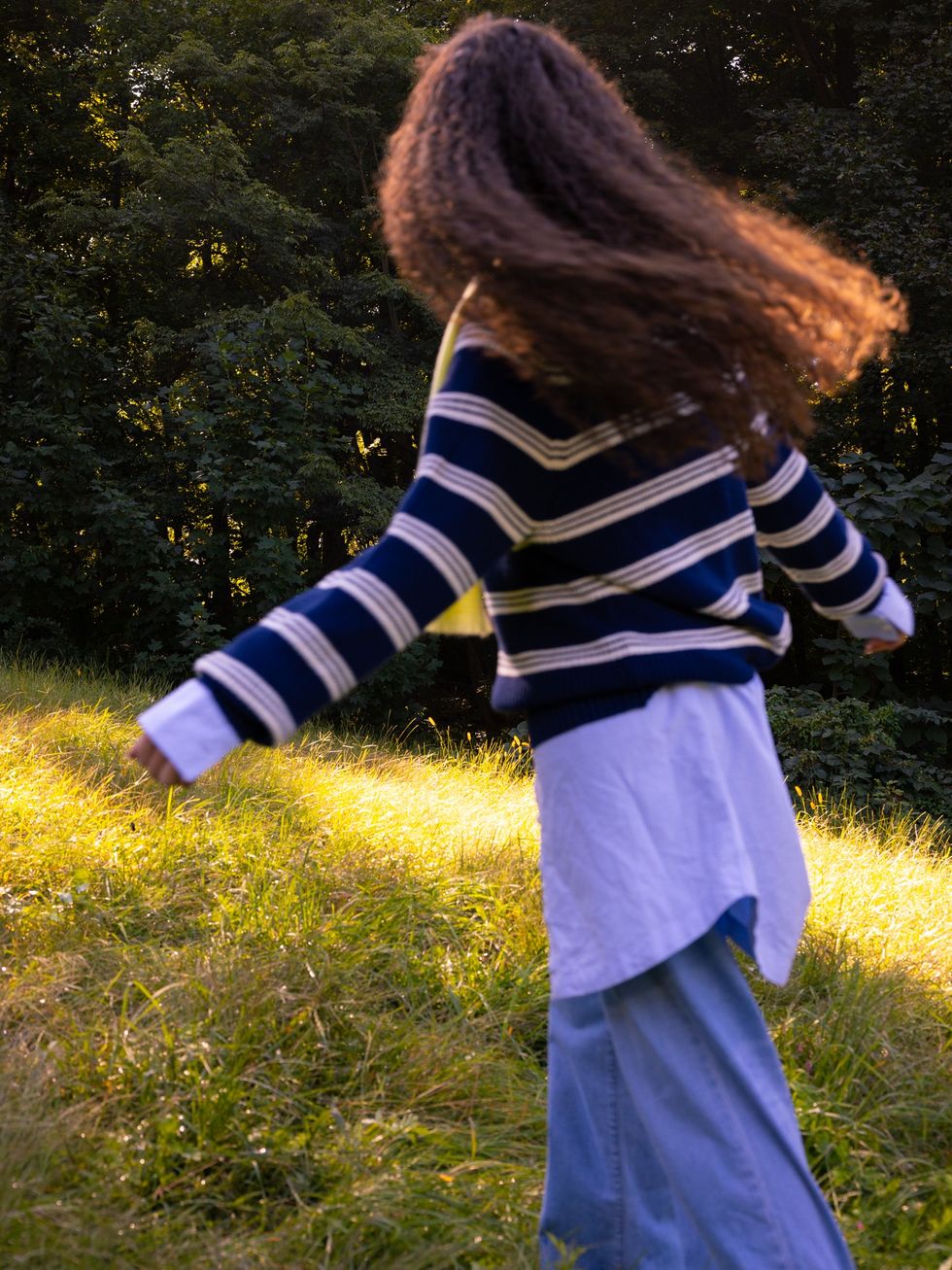 When you’re out and about, there’s something about brown seasonal staples. Sumptuous corduroys. Tactile knits. When the leaves appear as if they’re rusting, it’s nice to dress in a similar hue to the autumn foliage. Layer in an off-white and a pop of red among the range of neutral hues to keep things interesting (and to mimic the colors of the fruit you’re grabbing). Then, add a navy parka for the extra chilly day.