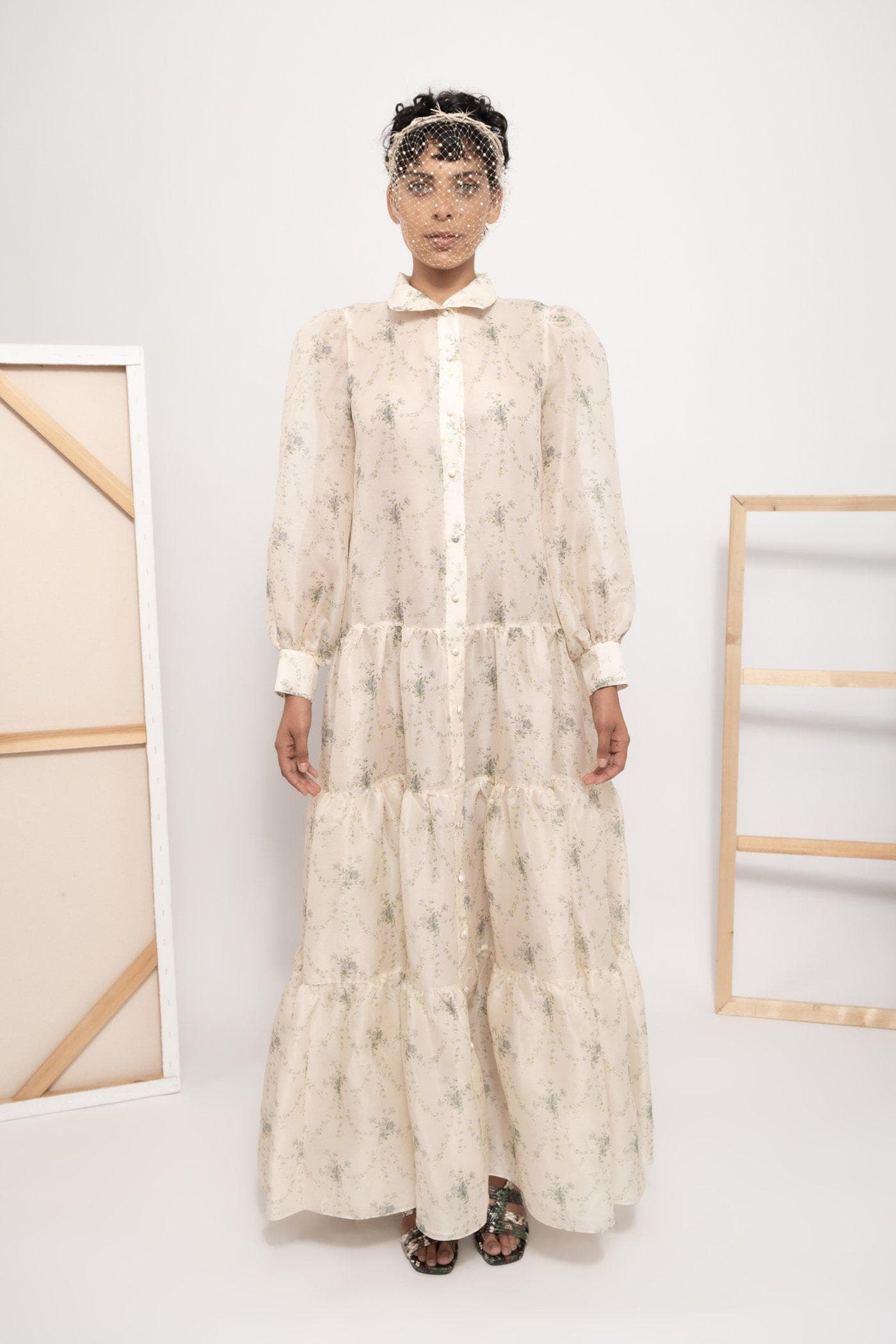 Photo: Courtesy of Lauren Kulchinsky Levison"I love this gown from Brock Collection that I wore this weekend to my friend's wedding out in the Hamptons. I was super comfortable and felt super ethereal, which always makes me feel confident. I topped it off with one of the many Jennifer Behr headpieces that I have collected through the years. The flowers in the headband complemented the flowers on my gown and picked up the emeralds in my earrings (from Kristen Farrell Jewelry). The wedding was outside, so I actually wore my Celine flat boots—no sinking into the hay grounds for me! The Mark Cross Grace Mini Leather Box Bag had just enough space for my Purell, alcohol wipes, mask (just in case), lipstick, and compact. I wore it cross-bodied so it didn't get in my way, and I hung it off of my chair through the night, which was a plus!"