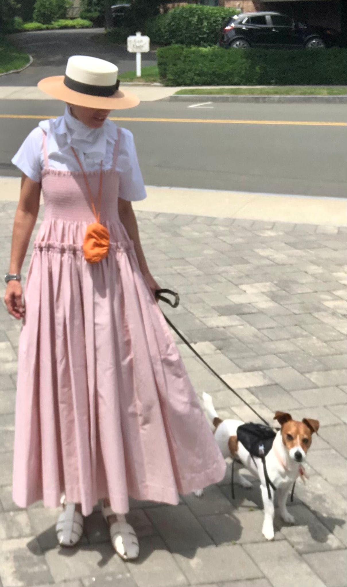 Photo: Courtesy of Lauren Kulchinsky Levison"I loved pairing this Molly Goddard smock-bodied pink dress with my Christian Dior blouse for a walk into town with Quinn. I live in dresses during the summer—I am not usually a sundress strap girl; however, I absolutely had to have this dress. To make it work for me, I will stick a blouse or a t-shirt underneath. In this case, I also added an Erdem scarf to create a neckline that I felt more confident in. This is the kind of dress that is perfect for summer—you can dress it up or down for any occasion. I wear a lot of Molly Goddard. It is amazing that her collection can go from the big, huge tulle yellow moment I had at London Fashion Week to the hot pink tulle edgy rocker dress (also available on Dora Maar right now), to this feminine pastel cotton frock. I felt totally beautiful in this look. If I needed to pop into a shop or grab a coffee while I was on my walk through town, I was perfectly dressed."