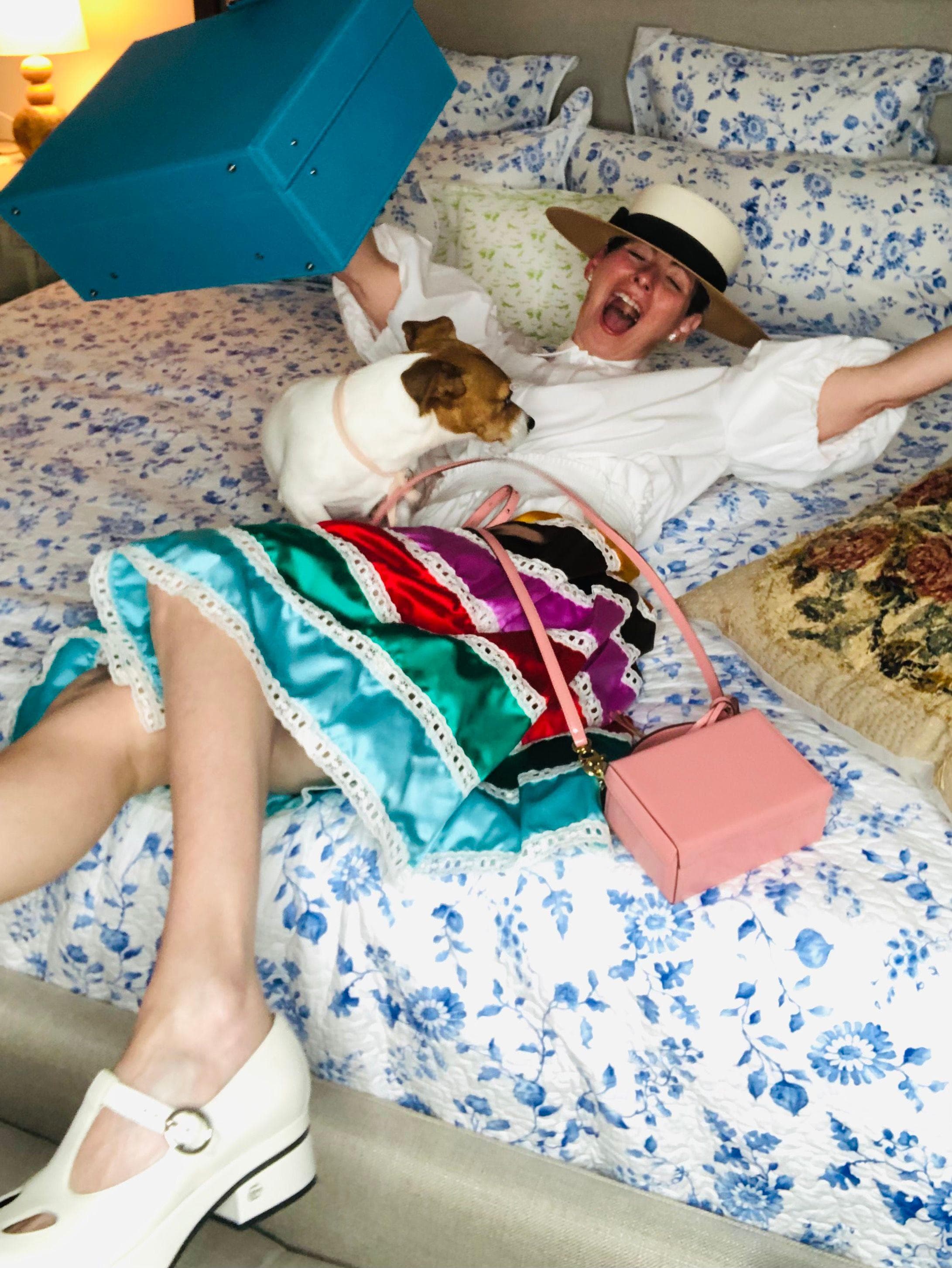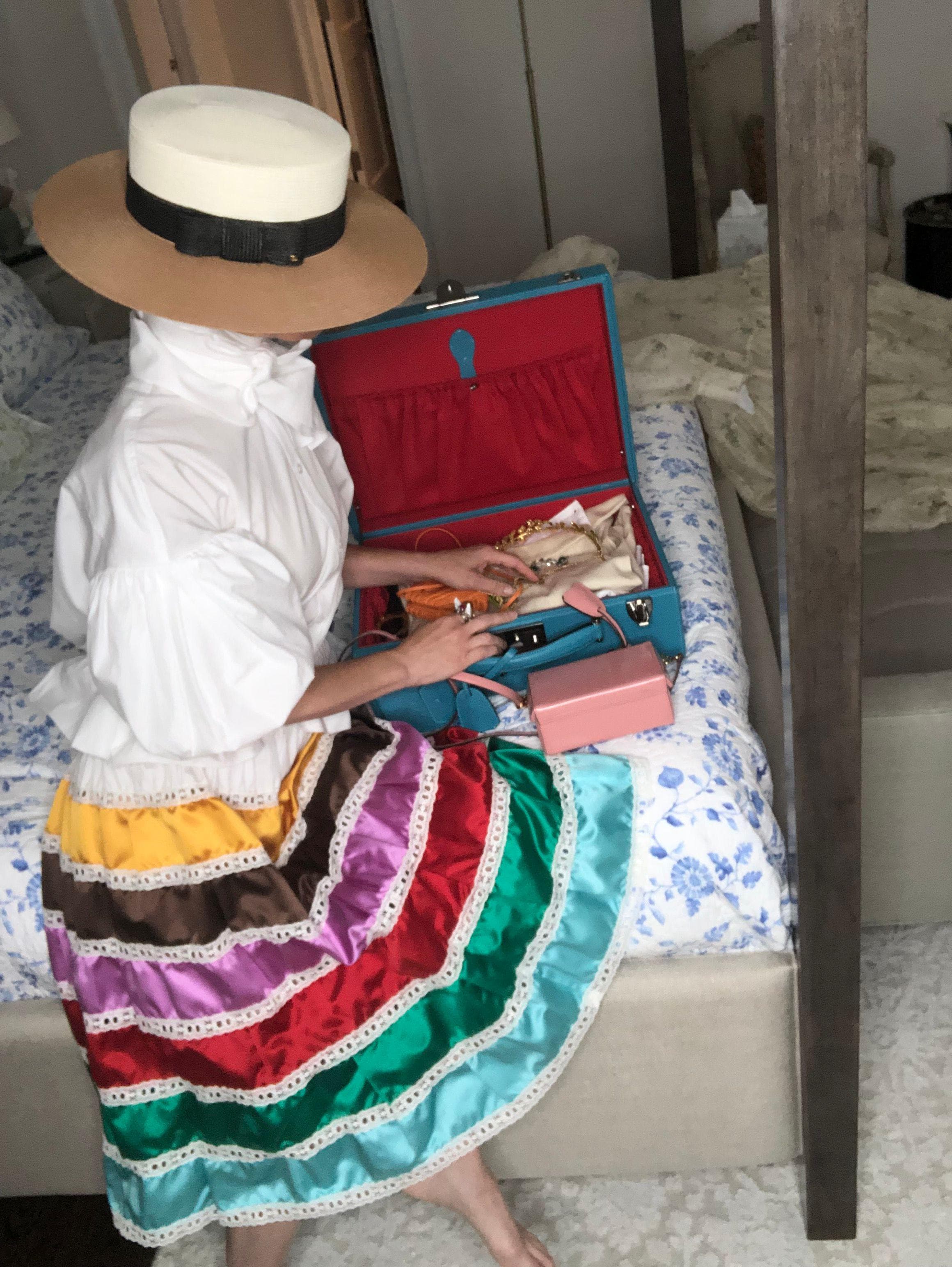 Photo: Courtesy of Lauren Kulchinsky Levison"This is my 'traveling to the Hamptons' look. Even though we have a home in East Hampton, I always need those last-minute essentials. Packing for the Hamptons in this Mark Cross Turquoise Leather Trunk is the best because nothing gets wrinkled or crushed. The Prada skirt is fantastic because it's a stretchy waist and super comfy for when there is traffic, and the fabric will not wrinkle! Plus, it's colorful and fun, and if the traffic is super bad, I'm already dressed for dinner straight out of the car, jewelry and all."