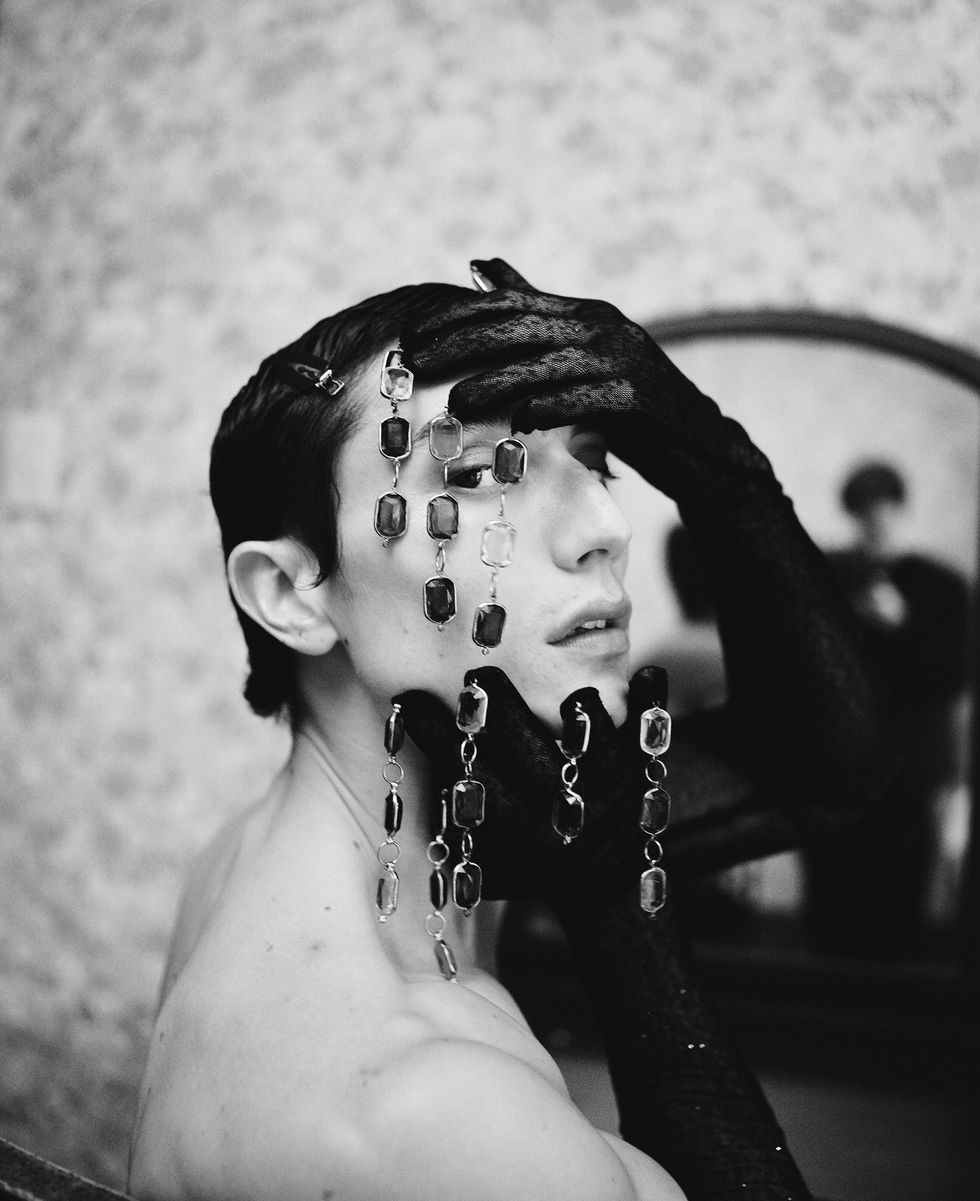 Withrow took cues from the late fashion photographer Deborah Turbeville, whose haunting, ethereal work often had a documentary quality as if the artist stumbled upon the scenes. “I like how it feels like she is there witnessing these moments,” says Withrow. The most recent Maison Margiela Haute Couture collection—itself an homage to photographs of the dissolute and decadent environs of Paris in the 1930s—was also a key influence for its rich textures and subversive approach to gendered silhouettes.