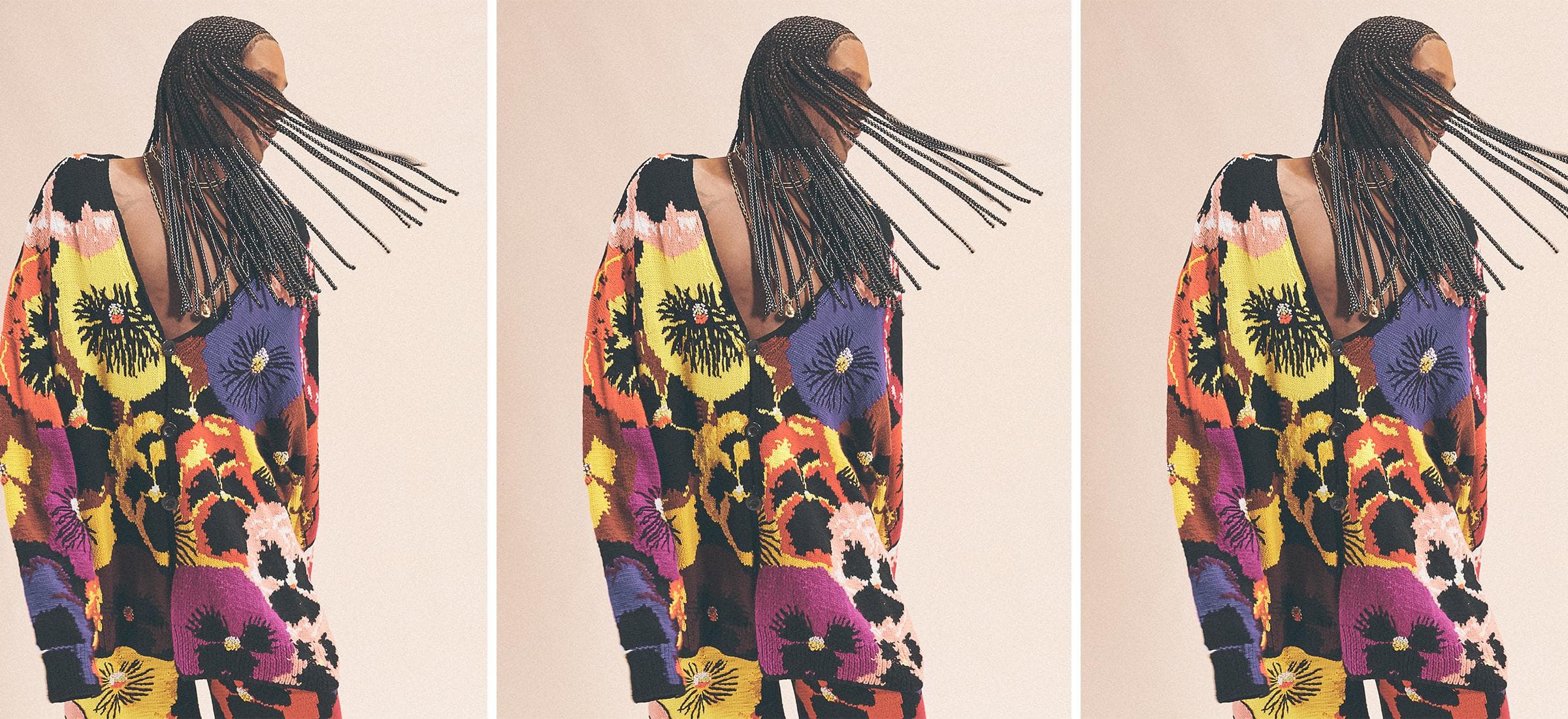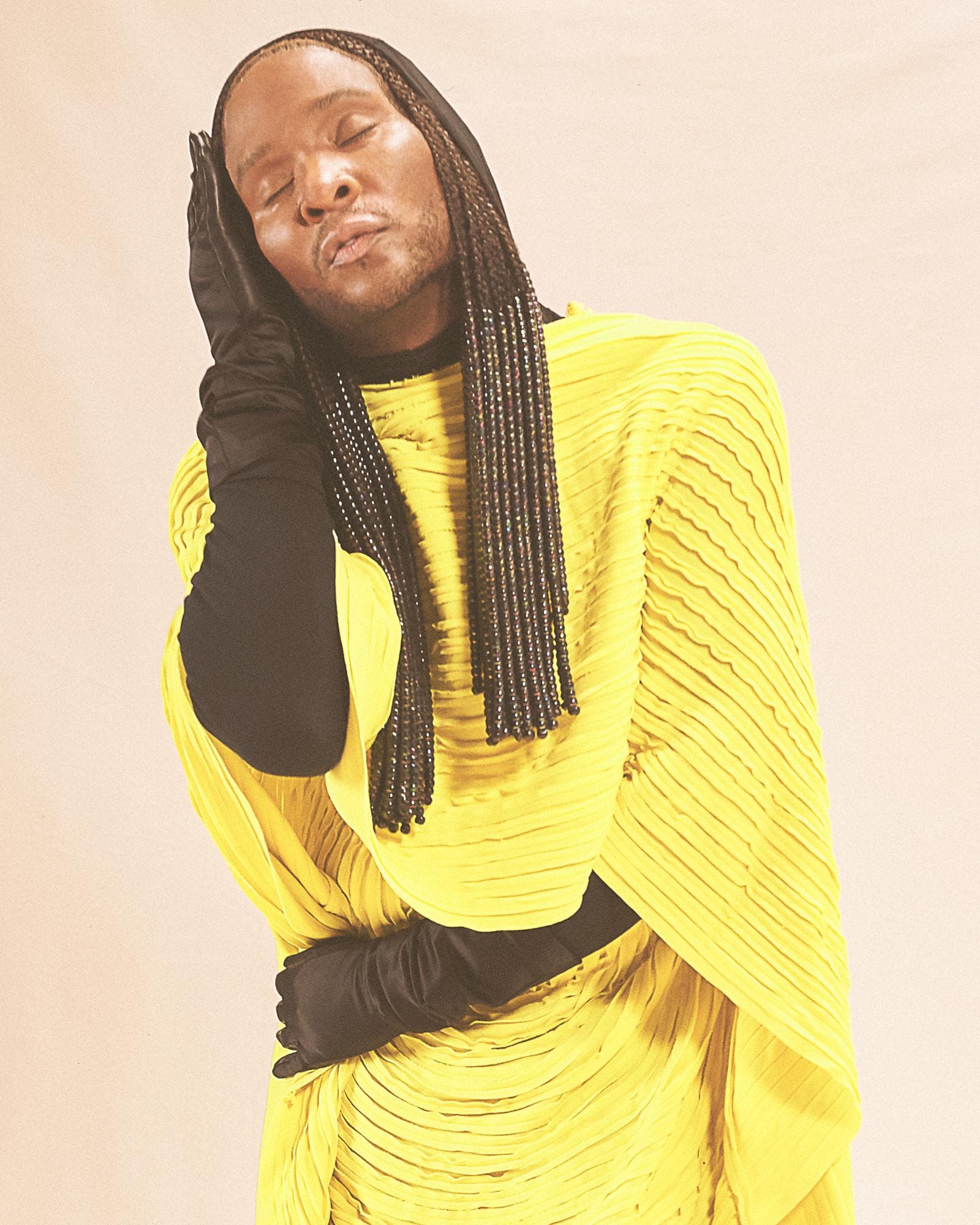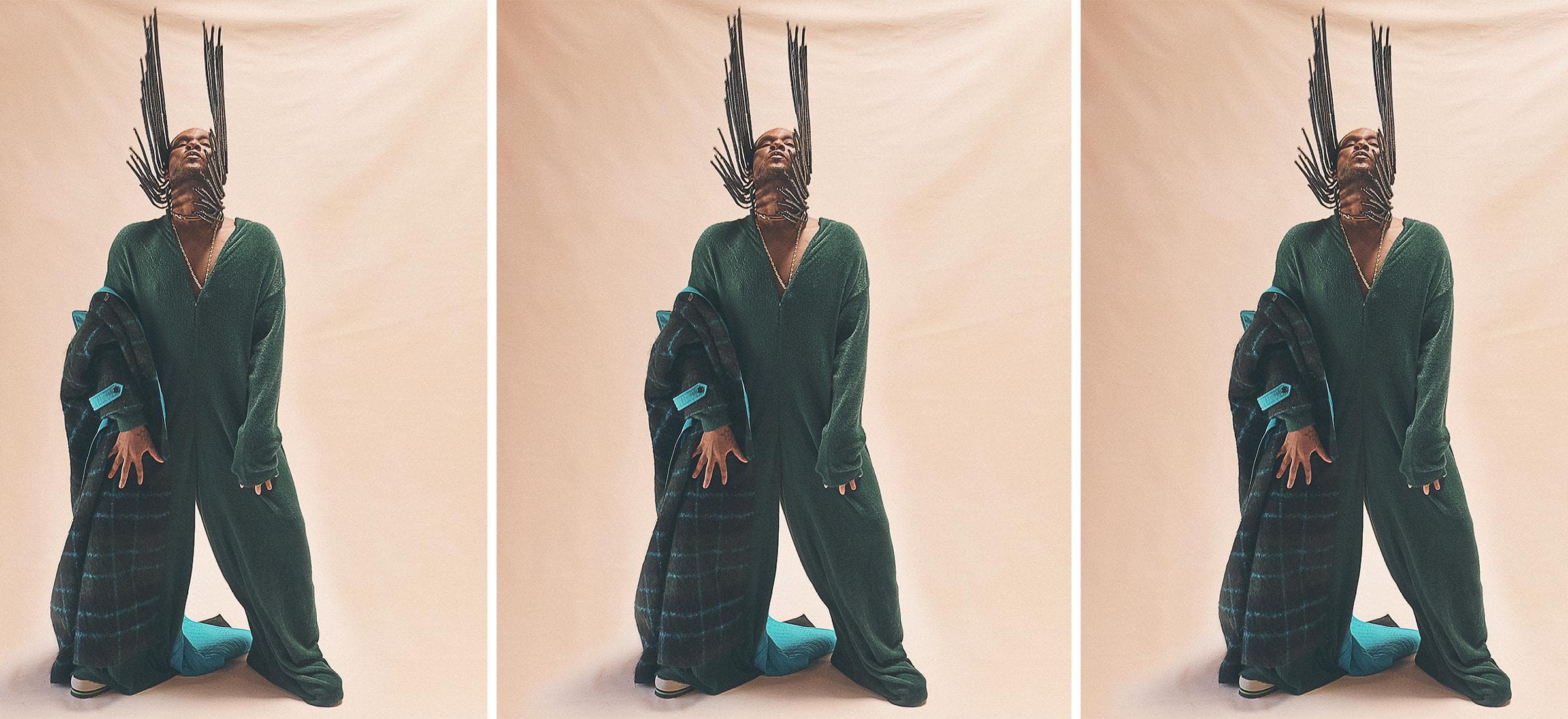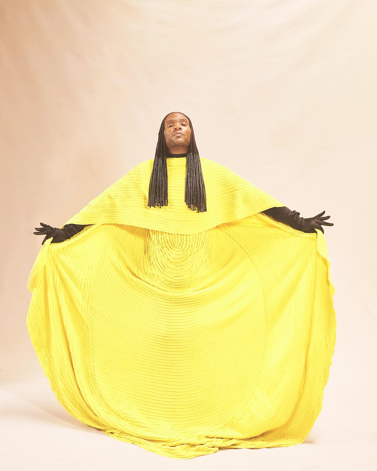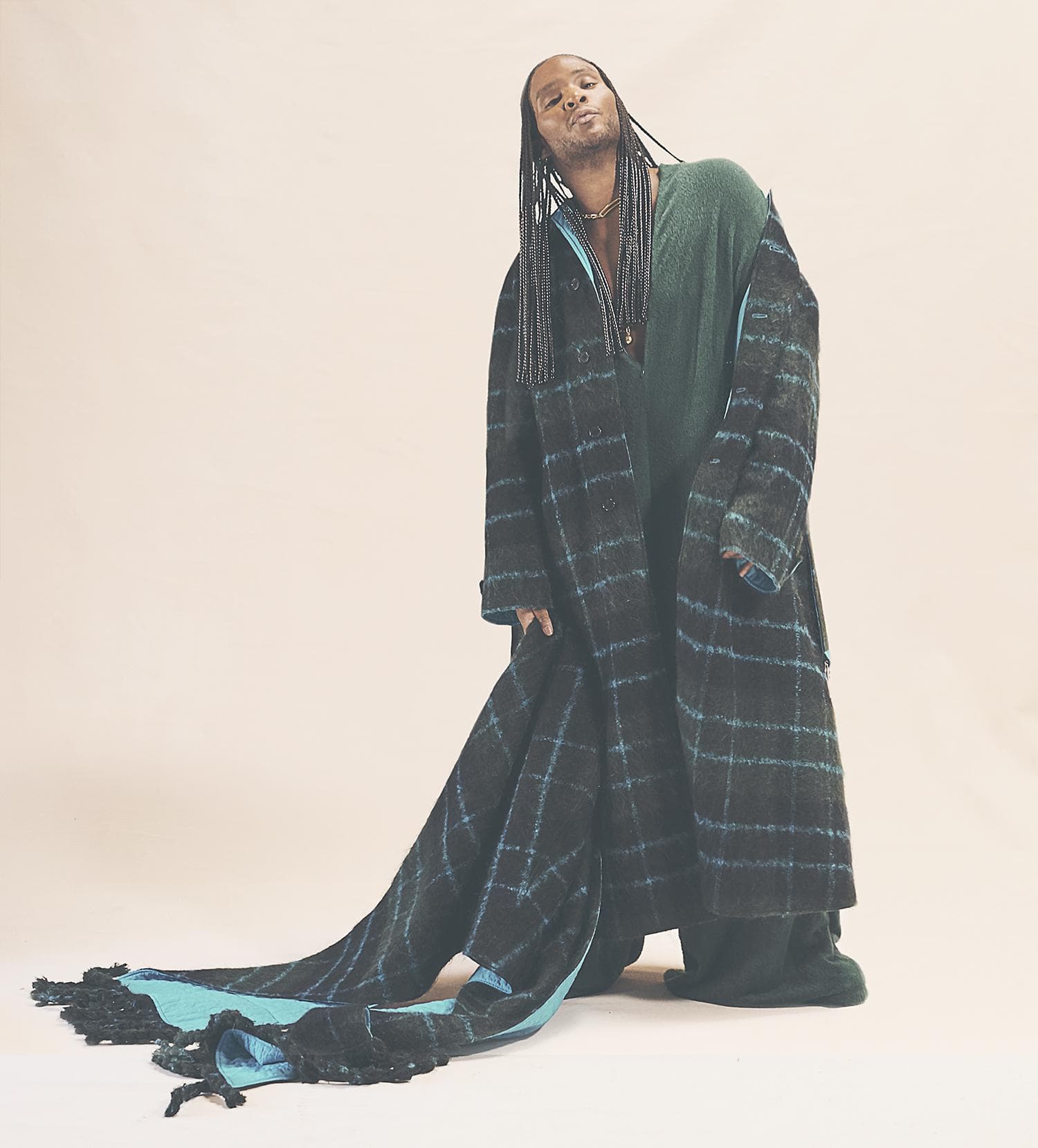 Fashion credits: Floral look: Law Roach wears sweater and shorts by Loewe, boots by Kenzo, necklaces by Tiffany & Co.; Green look: Roach wears jumpsuit and coat by Kenzo, boots by Kenzo, necklaces by Tiffany & Co.; Yellow look: Roach wears hat, gloves, and gown by Marc Jacobs