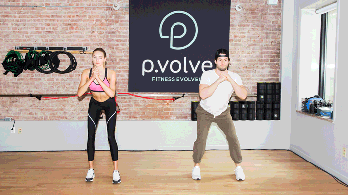 “With each foot on a bosu ball, angle your feet downward, making sure your heel is in the middle of the ball. Step one foot into one bosu with a narrow stance and into a P.sit. Then step back wide to the other bosu and P.sit.
