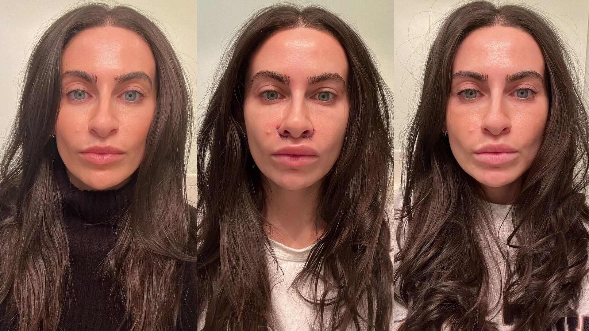 Performed under local anesthesia, my surgeon cut strips of skin from directly under my nose, removed those strips, then added sutures that remained in for five days-post surgery. “The incision is closed in a specific way to suspend the sides of the bullhorn incision to decrease wound care,” explains Dr. Ahmedli.