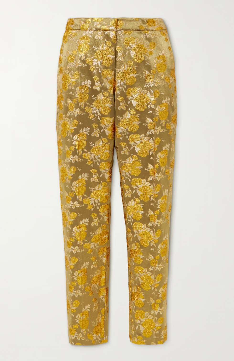 This ensemble is the perfect way to dip your toe into holiday style. The black velvet jacket and gold brocade trousers offer a sumptuous mix, while the more masculine brown leather loafers add the perfect contrast.
