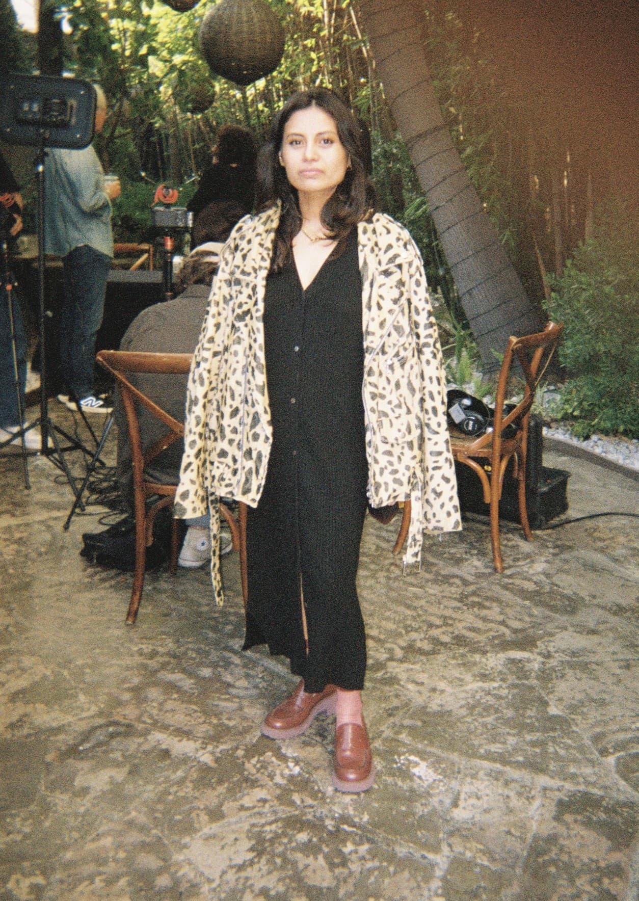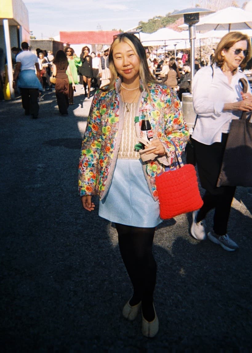 "The jacket is Dries, the dress is a random find from The RealReal, and the shoes are Camper loafers I wore so I could comfortably make my way through the fair. I definitely wish you caught me wearing sexier shoes."