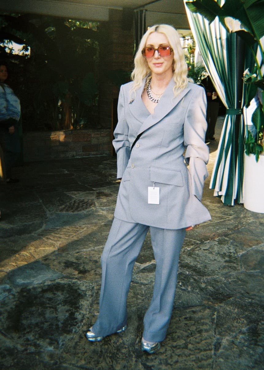 "I’m wearing Gucci sunglasses, Vitaly necklace, dollar sign ring by Andy Warhol, Raf Simons for Adidas sneakers, Zana Bayne bag, and a vintage '70s mens suit that I redesigned for myself."
