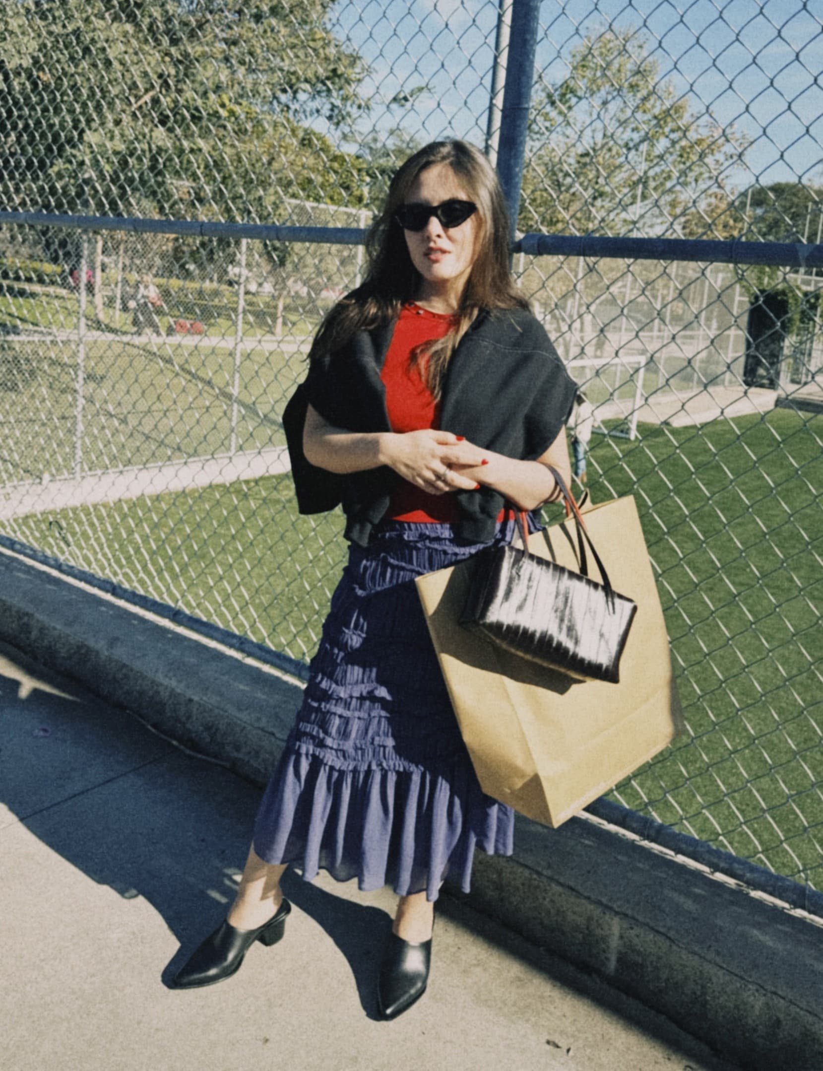 "The top is Wildheart MX by Rebecca Garrido, skirt was a gift from CDMX stylist Jocelyn ZJ Corona, earrings by Muddpearl, bag is vintage Miu Miu, blazer is vintage Dior, boots are vintage Guess."