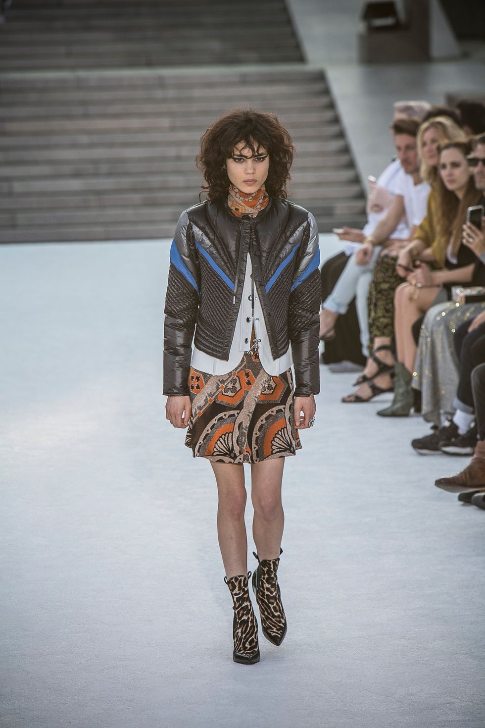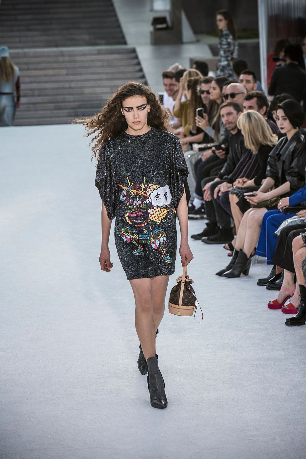 Louis Vuitton’s Cruise show took place an hour outside of Kyoto this past weekend, and while Japan served as a backdrop for the event, it was also part of the inspiration. Dresses featured sequined samurai, bags had Kabuki eyes, and makeup looks were smeared with an exaggerated cat eye. As models walked down the runway with a bad-ass biker confidence—influenced by the fictional female gang of the Japanese film Stray Cat Rock (plot: group of girls take on a racist mob boss; take away: girls rule)—guests like Laura Harrier, Michelle Williams, and Jennifer Connelly looked on, admiring everything they saw.