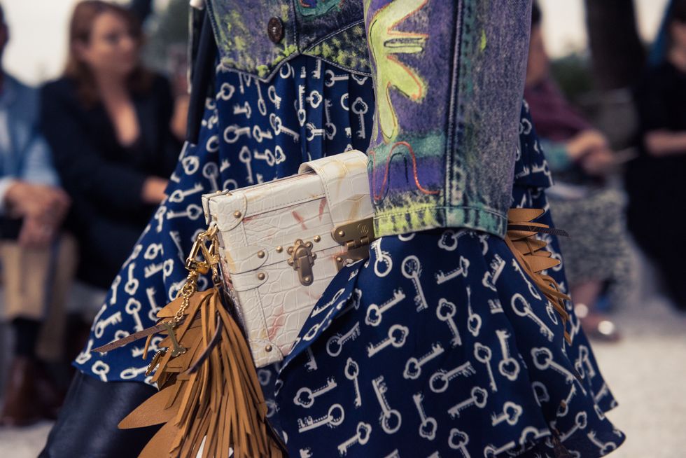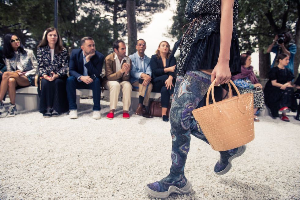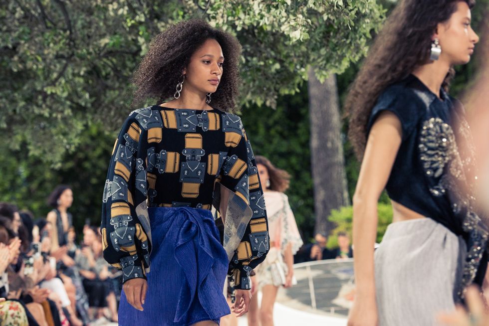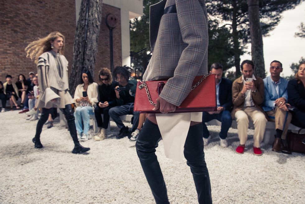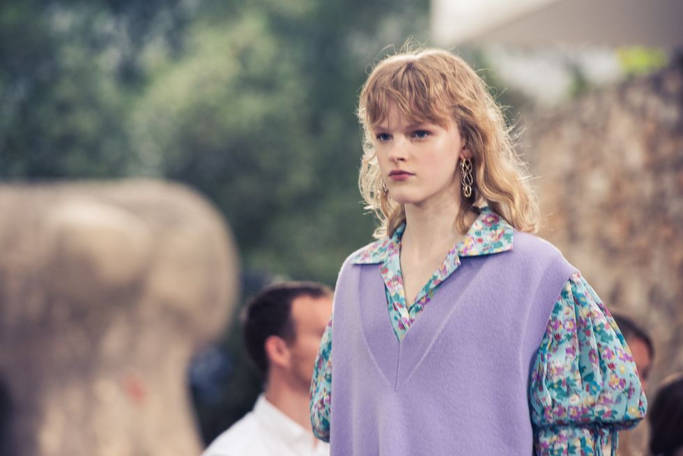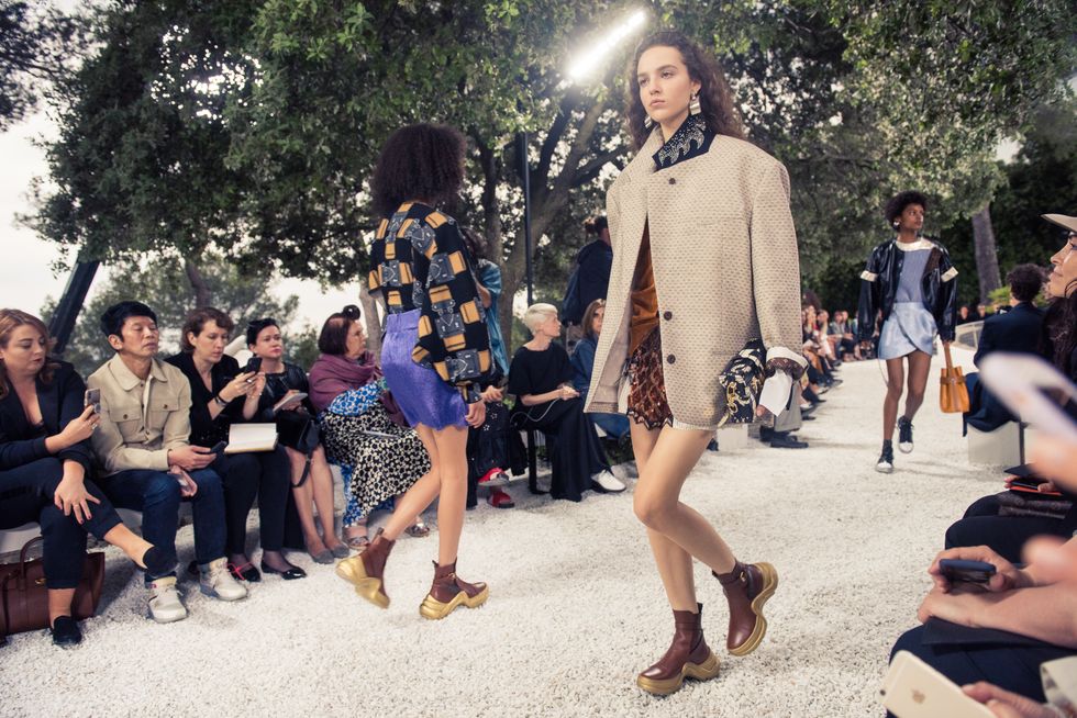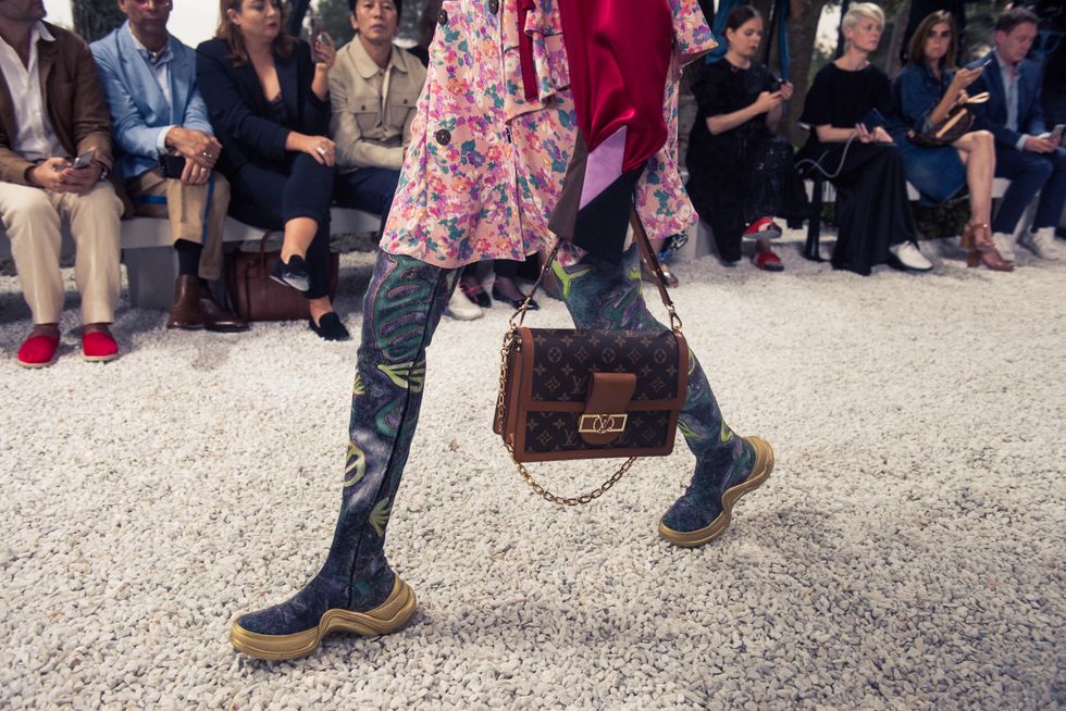 Yesterday, we stepped into Saint-Paul-de-Vence’s Fondation Maeght for the Louis Vuitton Resort 2019 show, where Nicolas Ghesquière sent models down the runway in layers of deconstructed and reimagined separates. Prints ran the gamut from plaid to stripes to florals; there were thigh-high sneaker-boots, *those* trainers that the fashion set is currently obsessed with, and Coddington’s touches—illustrations of her two cats and Ghesquière dog emblazoned on LV-monogrammed accessories.
