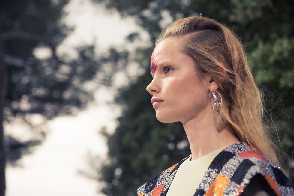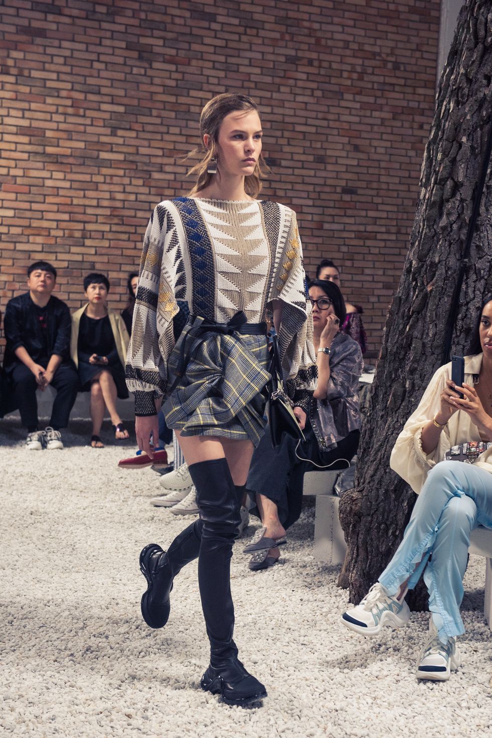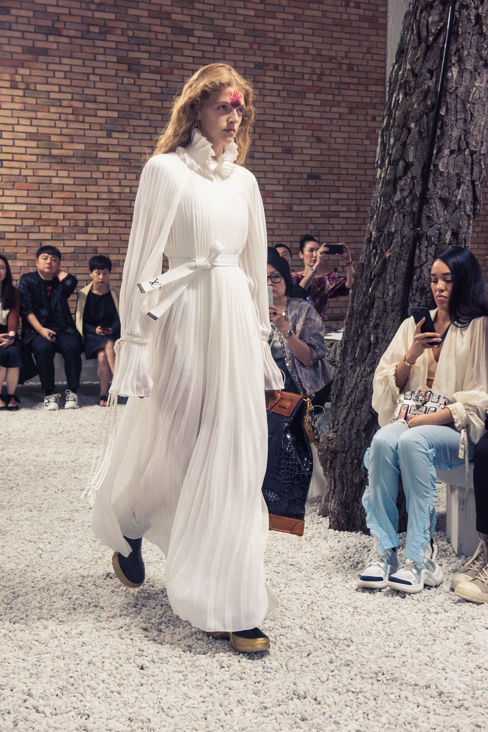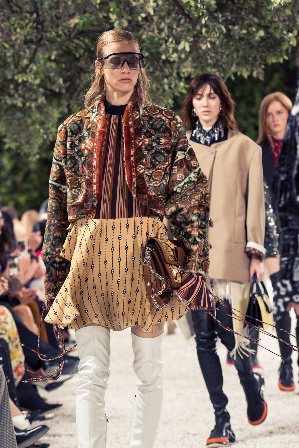 Yesterday, we stepped into Saint-Paul-de-Vence’s Fondation Maeght for the Louis Vuitton Resort 2019 show, where Nicolas Ghesquière sent models down the runway in layers of deconstructed and reimagined separates. Prints ran the gamut from plaid to stripes to florals; there were thigh-high sneaker-boots, *those* trainers that the fashion set is currently obsessed with, and Coddington’s touches—illustrations of her two cats and Ghesquière dog emblazoned on LV-monogrammed accessories.