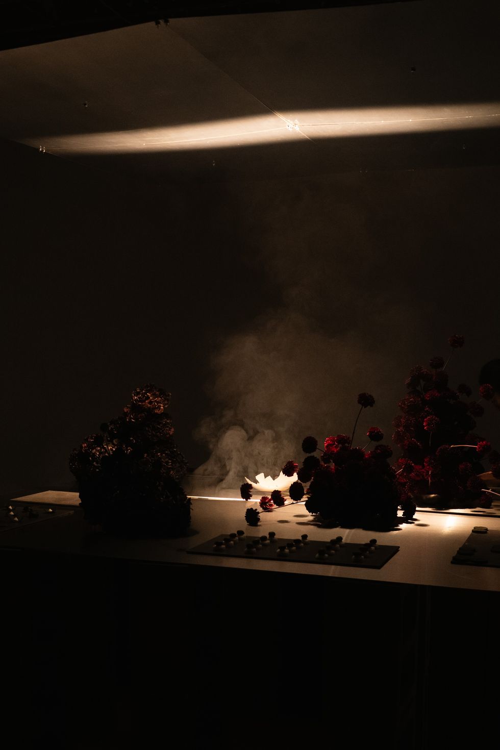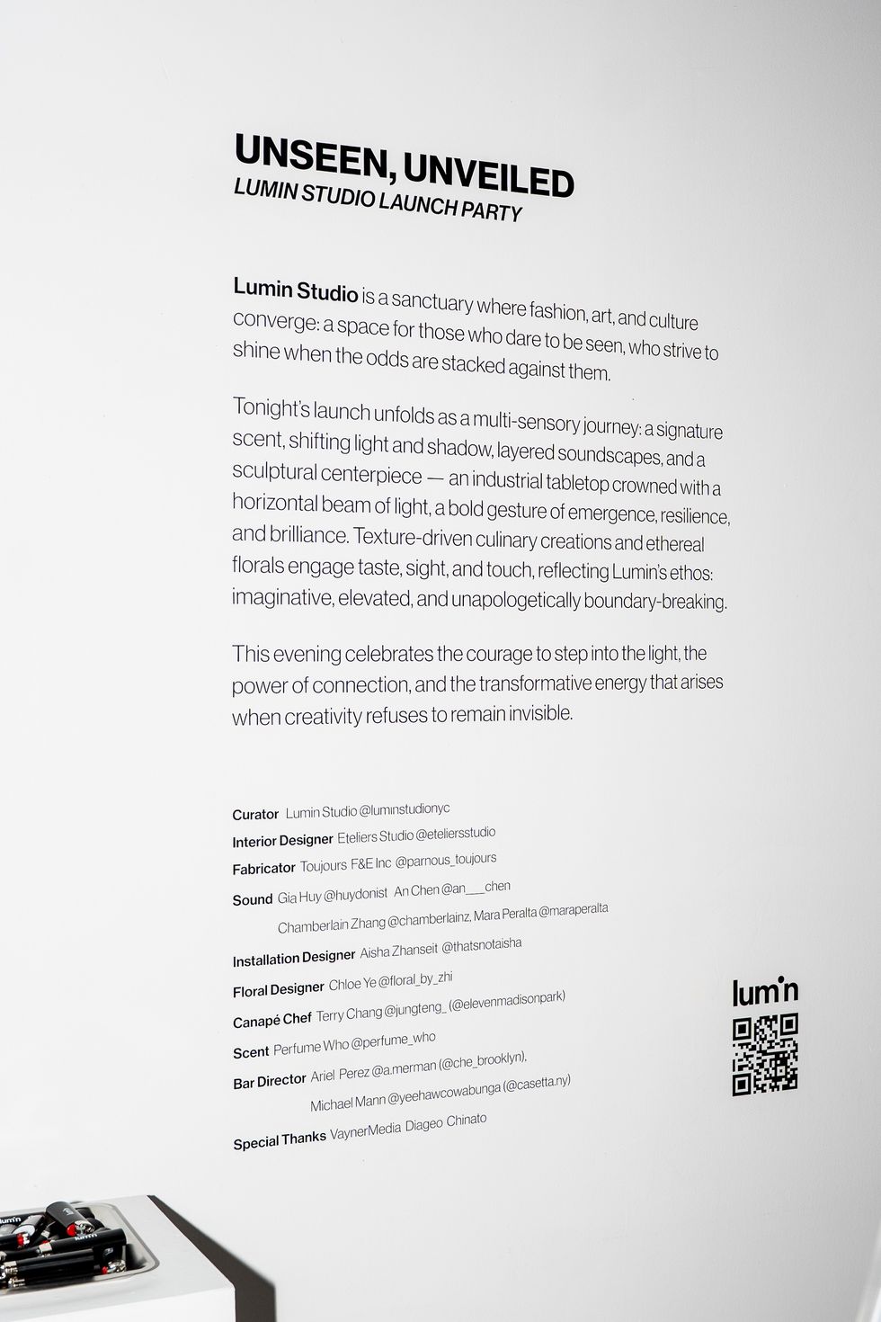 At the launch party, light fixtures felt like art pieces and hors d'oeuvres felt like decor. Everything felt intentional, down to the island bar and large communal table basked in a beam of light topped with floral arrangements and the complimentary Lumin lighters gifted upon entrance. "Texture-driven culinary creations and ethereal florals engage taste, sight, and touch, reflecting Lumin's ethos: imaginative, elevated, and unapologetically boundary-breaking," the wall read.