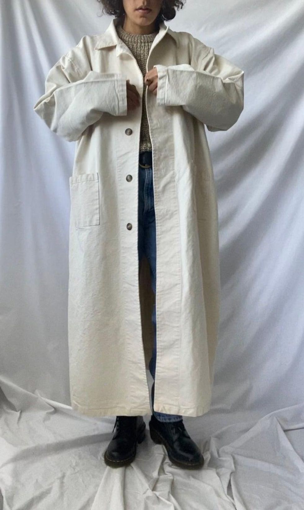 "This coat is one of my favorite thrift finds. It's the perfect weight for *slightly chilly* Vancouver days. Also, a yellow jacket lifts my mood when it's not actually summer yet. The crochet top is a favorite because it's like wearing no shirt, but also completely covered? And these diner check pants from Wray NYC are basically pj's but have a certain 'wow' factor. Soft and comfortable, this look fools people into thinking I have it together during these pandemic times. What's not to love? And, of course, rounding out a bit of a grandpa vibe, soft blue loafers from go-to shoe brand Intentionally Blank."