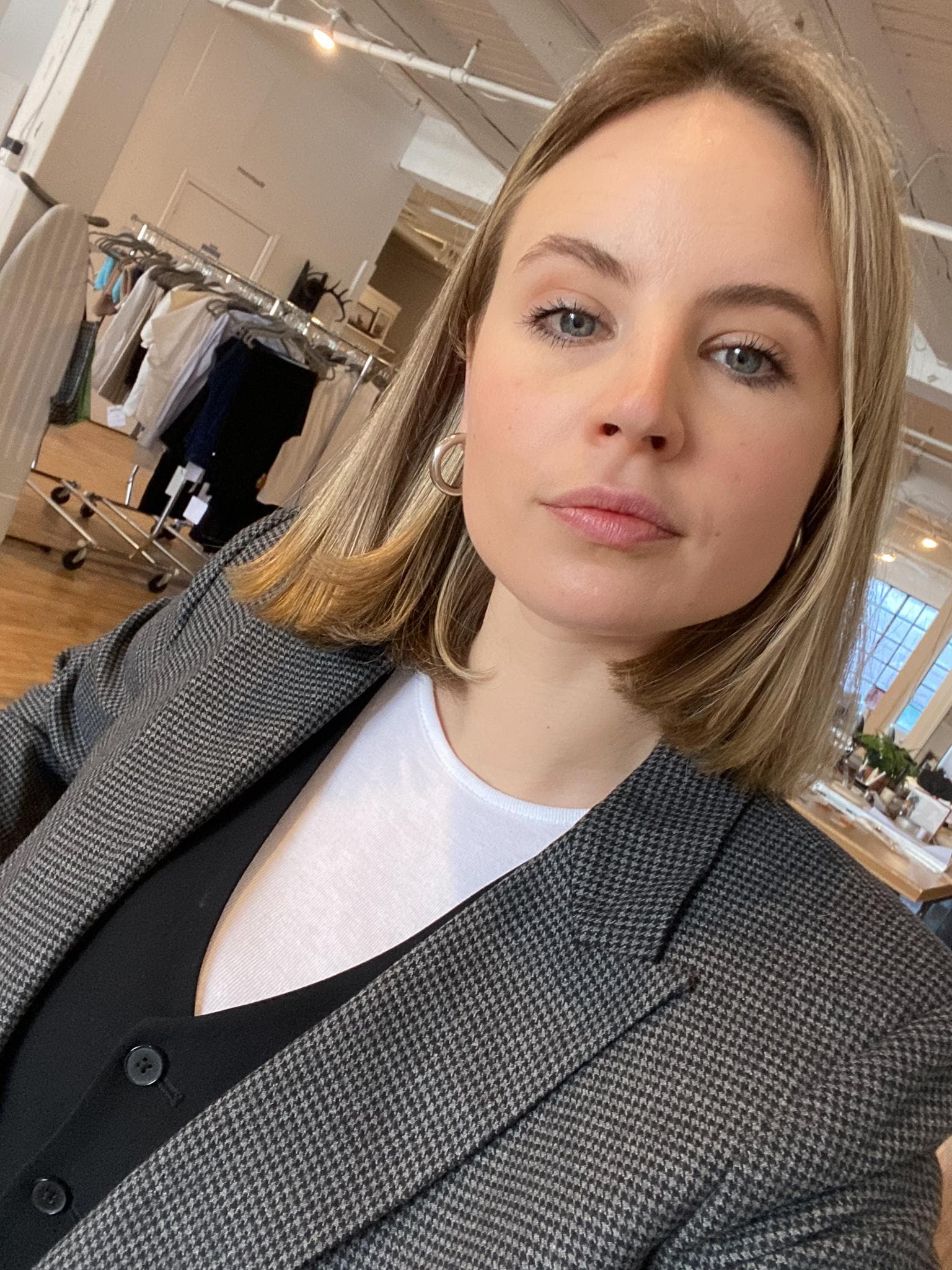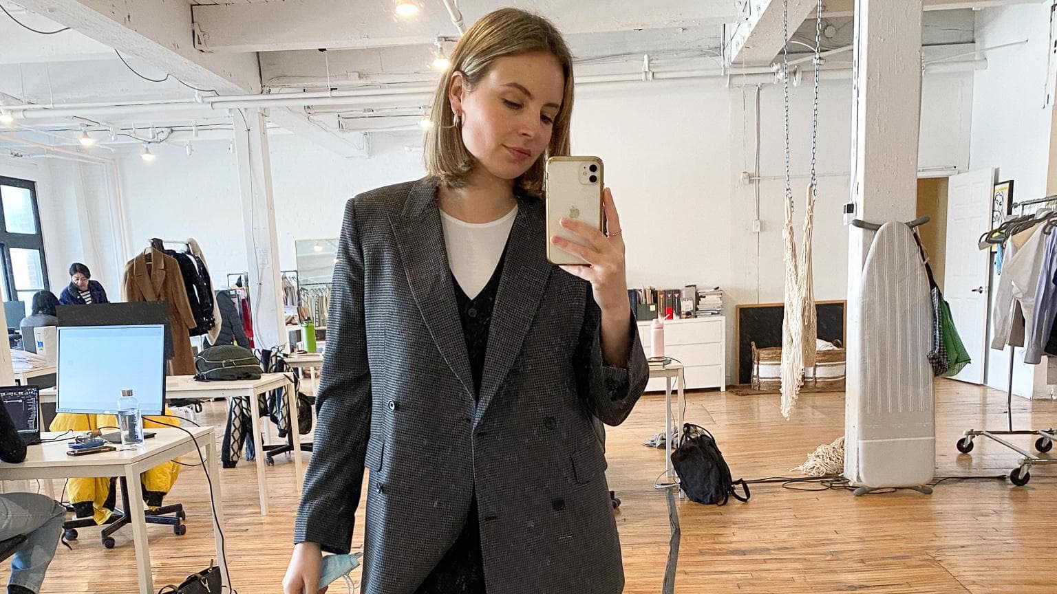 “Now that I spend so much time working from home, it’s nice to dress up a little when going into the office. I was actually wearing a different jacket but changed into this when I got into work because this blazer was a new sample. Working in fashion means half the time I end up changing into something else mid-day. I still kept it casual and comfortable with a white t-shirt and Converse!”