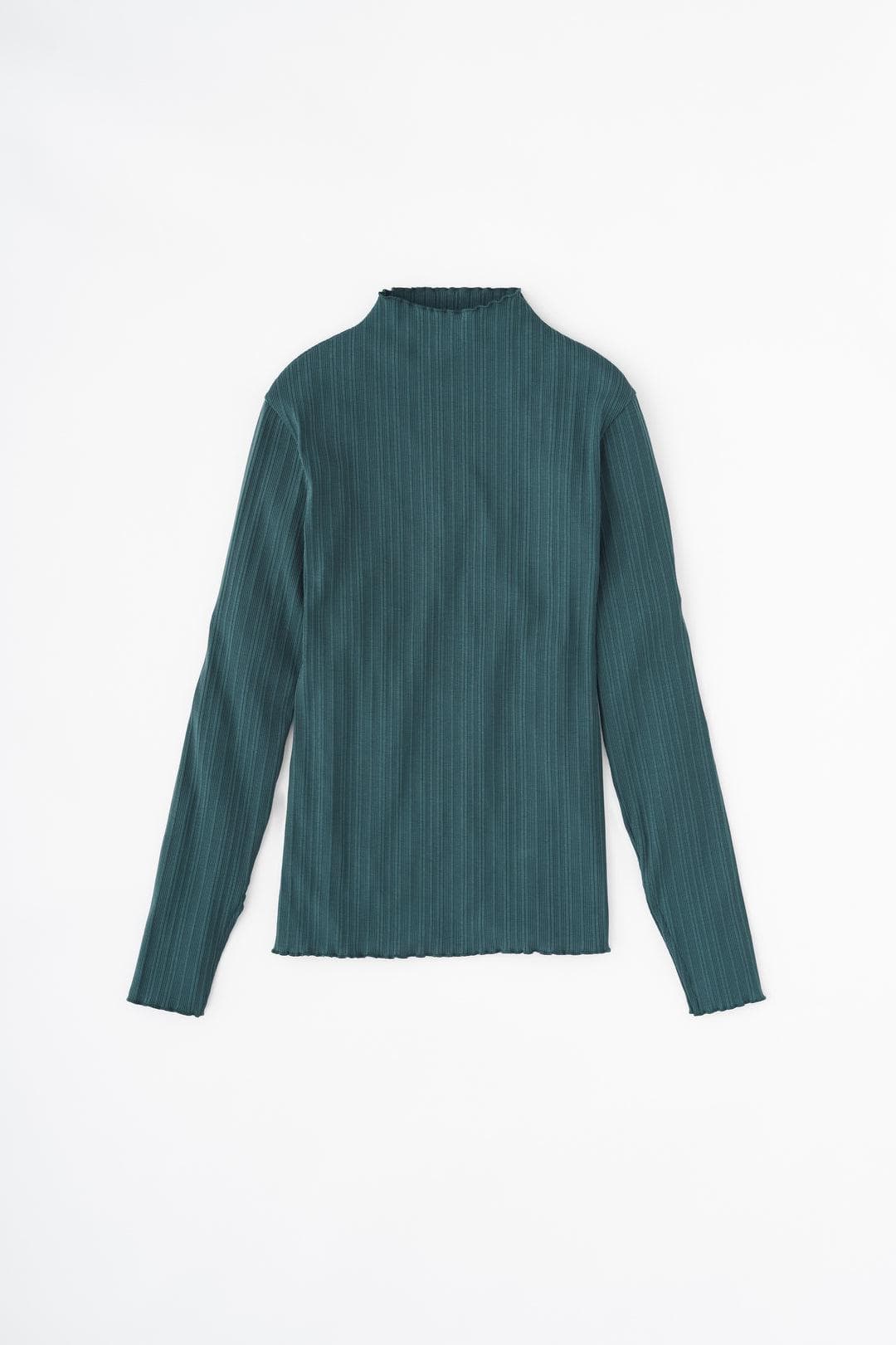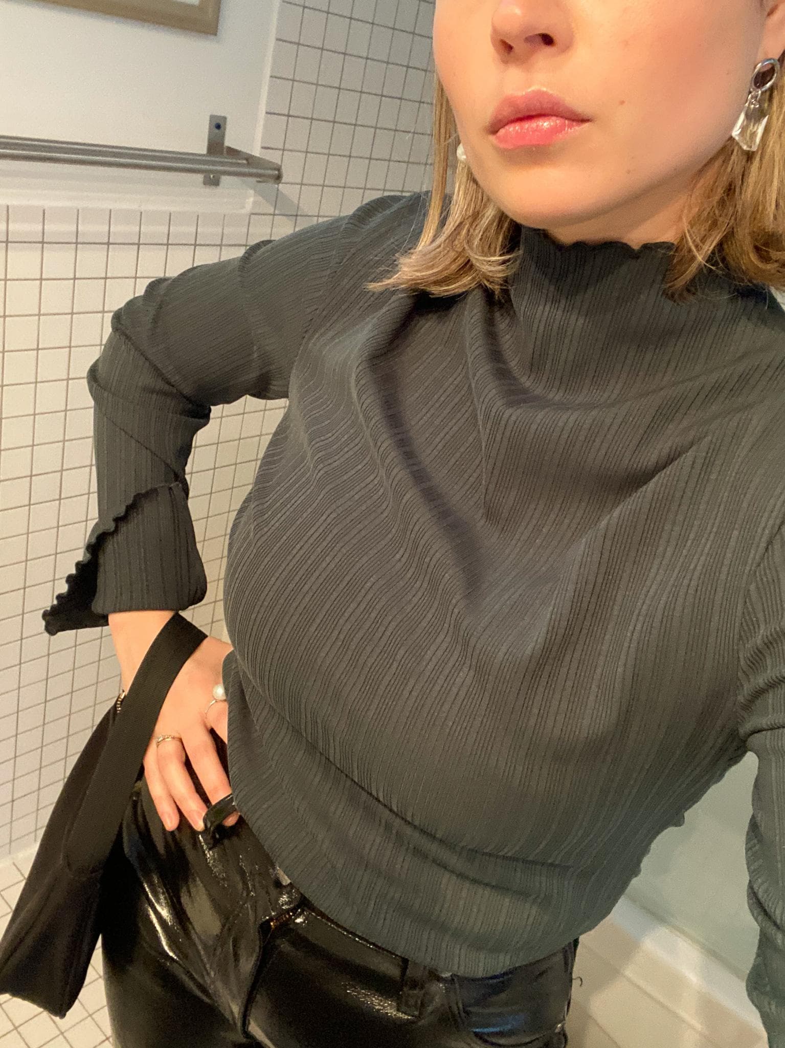 “This ribbed mockneck is one of those pieces that just makes me feel good. The green color, the rib, and long sleeves with slits at the wrist are the small details that make it feel fancier than a classic turtleneck but is just as versatile and easygoing. These vintage coated-denim Wrangler jeans always make me feel a little rock and roll. I also like how the earrings are really pretty individually, but the fact that they are mismatched makes them feel edgier.”