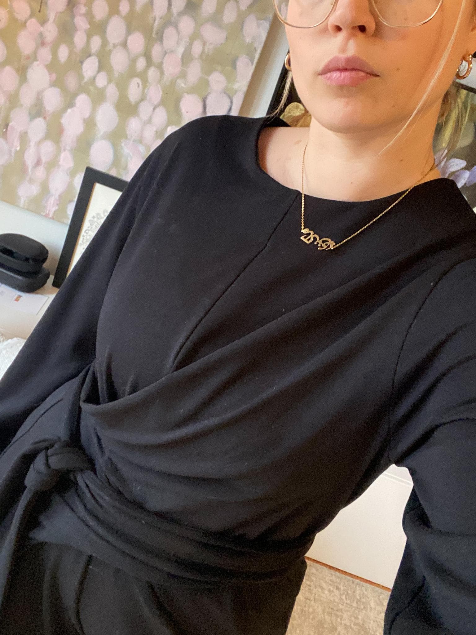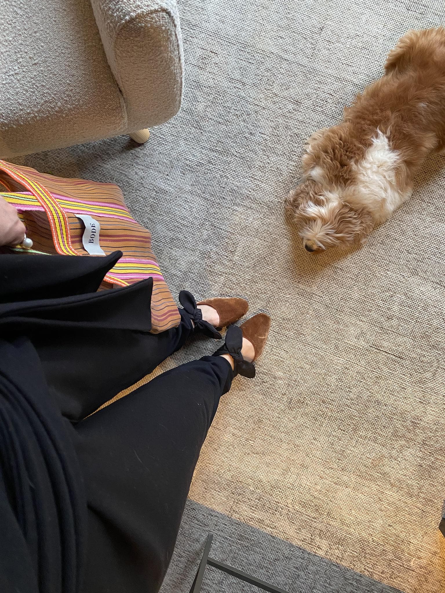 “The thing that’s great about this look is that it requires zero decision-making since it’s a jumpsuit. I paired it with these velvet mules, which are basically like slippers. When I ran out to the grocery store, I also grabbed this Bode tote, which I use as a diaper bag. For jewelry, I just wore simple gold hoops and my Arabic nameplate necklace.”