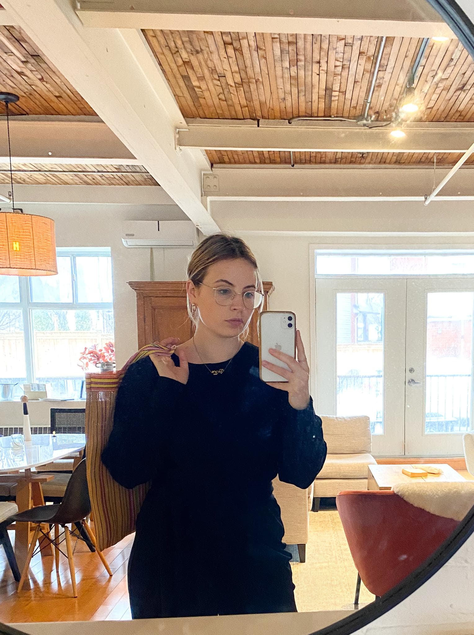 “Starting a sustainable brand and learning more about the garment industry has caused me to shop a lot less and dress much simpler. I wear mostly basics—t-shirts, turtlenecks, cotton knits mixed with wide-leg pants and add a twist with vintage pieces and accessories. Living through the pandemic and having a baby last year has made me really value comfort more than I had before. I still like to look put-together, so I look to natural fabrics, relaxed tailoring, and good cuts, but these days, I can’t even think about wearing heels!”