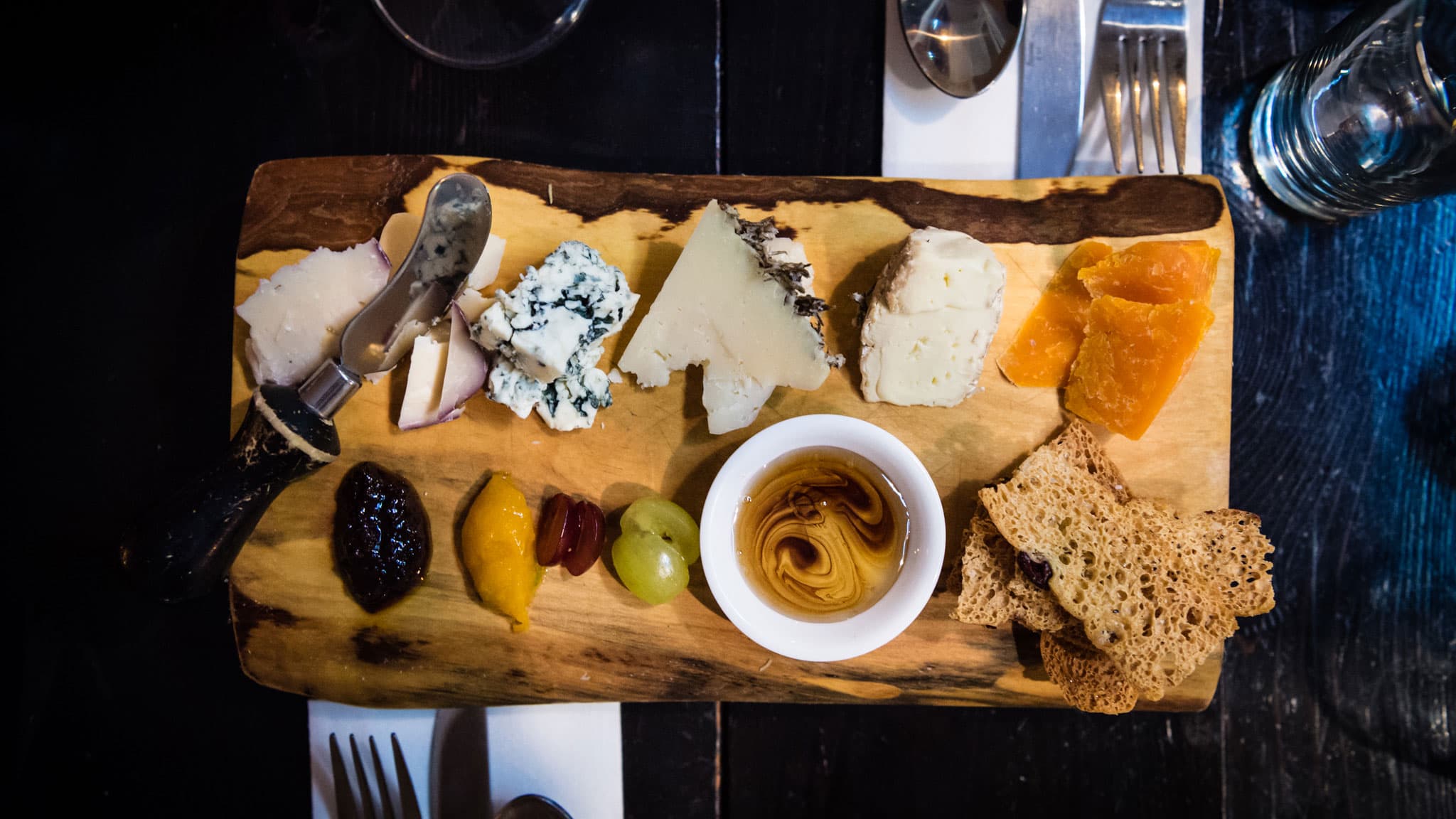 Next, accompaniments. A little compote, jam, or honey for sweet and tartness; cornichons and pickles; dried fruit; olives; nuts (Nuit Social does candied walnuts); and crostini, bread, or crackers. You want to balance the richness and textures of the cheeses with whatever you offer up as a pairing, so keep flavor combinations in mind.