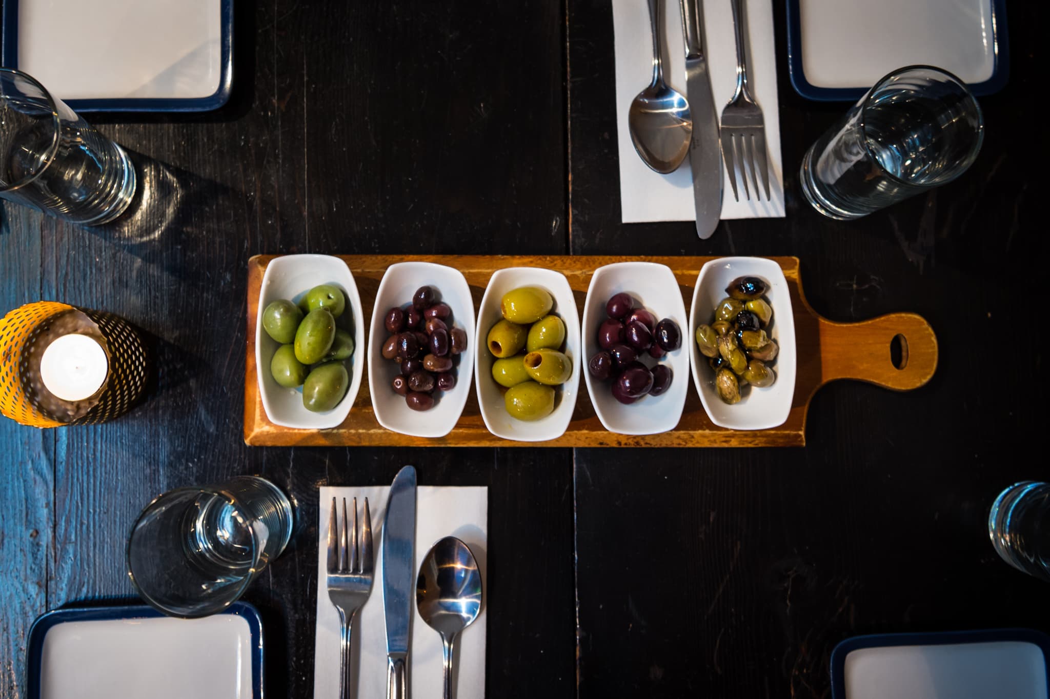 Offer up mini napkins; something for people to stash cheese rinds or olive pits in; and one or two cheese knives (depending on the size of the board) to help your guests deal with the deliciousness.