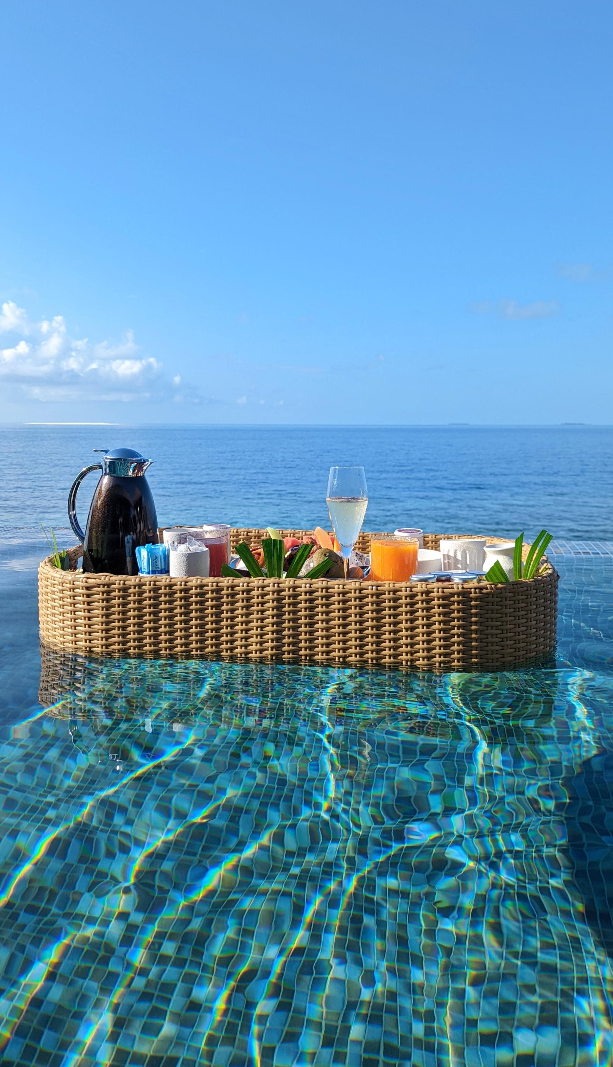 Slip out of bed and into a bikini for breakfast. A floating Champagne breakfast can be set up in the private infinity pool at your villa, filled with fruit, pastries, coffee, and more.