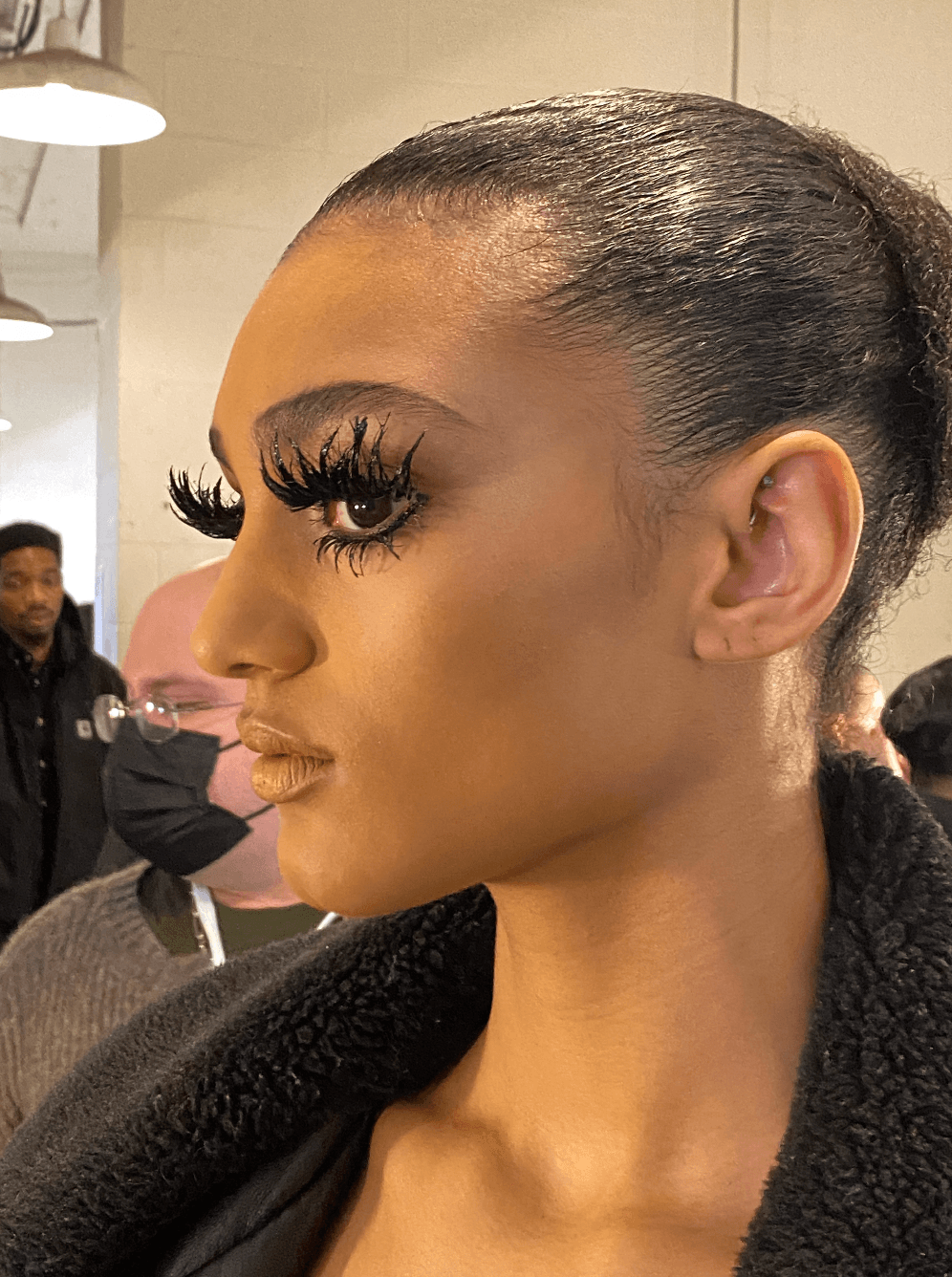 Ahead of the show, her team spent two days coating the top and bottom lashes with black nail polish to give them a spidery and shiny finish. The top lashes were lined with black eyeliner before applying the lashes with black Duo glue “to give some real density to the eye,” explains Kendal. The makeup artist finished things off with a matte lip. “We used a taupe lip color and dabbed foundation in the center to create a very matte mauve lip.” All together, the 60’s inspired, doll-like look was a visual surrealist feast.