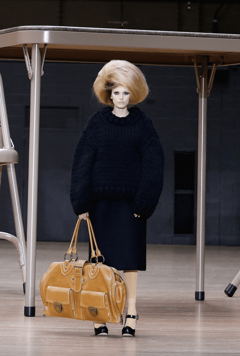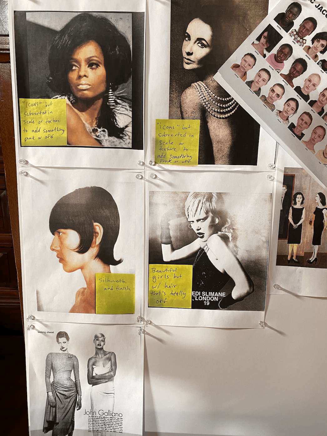 “The shape is a suggestion of that late 60s, early 70s disco moment,” explains Duffy. On the moodboard for the show, one can spot an image of The Supremes featuring their towering, heavily teased bouffants. While the looks for the show weren’t a direct copy or literal interpretation of the R&B girl group, it was the starting point for the idea of overly proportioned hair.