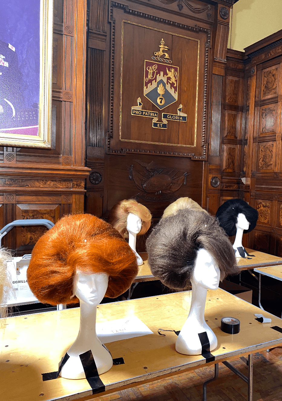 When Duffy landed in New York City on Wednesday, after spending the week working on couture shows in Paris, one thing at the top of his to-do list: find wigs. The key hair stylist for the Marc Jacobs Spring 2024 show had to source 108 full-lace human hair wigs in less than 48 hours. “We had to strip them all from the silicone, hand color them, crimp them, then set them,” says Duffy backstage, a few hours before the show. Everything about the show is an “absurd play on silhouettes, proportions, and structure,” explains Duffy. This includes the clothing, the set—Robert Therrien's sculpture, "No title (folding table and chairs, beige),” is featured—and the beauty looks.