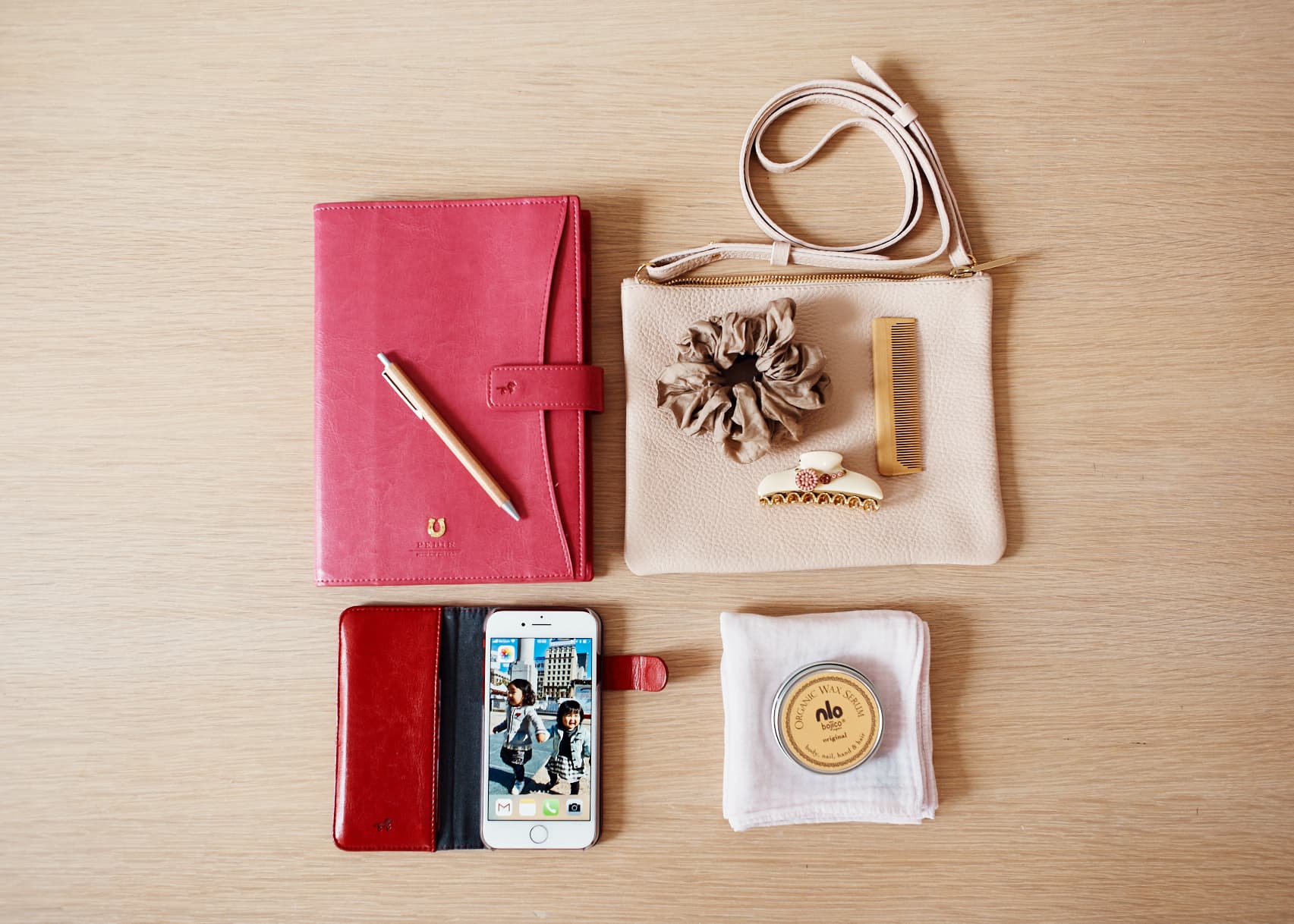 “All the symbols really spark joy for me, and the texture as well, and the little crystal there. It has enough space for all my credit cards. This is a multi-use wax serum for anything from hair, to cuticles, to hands. It’s an organic oil, this wax, and I think it’s great. This is a Japanese hair comb. In Japan, it’s kind of an etiquette for women to always carry handkerchiefs. So I’ve been doing that all the time, but in the States I was surprised that nobody carries handkerchiefs. They’re not sold in stores either.”
