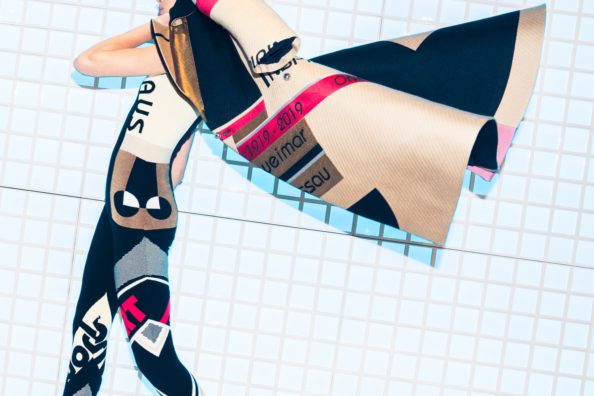 “Last season it was about the beginning of Modernism—so taking it from the arts-and-crafts movement and William Morris’ textiles up to Bauhaus via Pointillism, and how it changes. William Morris and the decorative nature of his designs, and the more pragmatic and pure vision of Bauhaus, are both parts of my work. At the beginning of the collection, we were trying to bleed one into another. We put a lot of images up on a mood board, trying to cross the gaps between the two. And you find a lot more similarities and synergy between the two as you do it. We were looking at Victorian tiles and how they were very similar to a Bauhaus building and bringing that into the collection. Then I’ll sketch and do different collages with a lot of the imagery on the body to see how it fits and scales. We will take those collages, and it will inspire everything that we do with the silhouette and textile design. Then it’s back and forth between myself and my team. I’ll do something and I’ll give it to my print team, and they’ll continue the design or they’ll find a reference and give it to me, and I’ll place it on the body.”