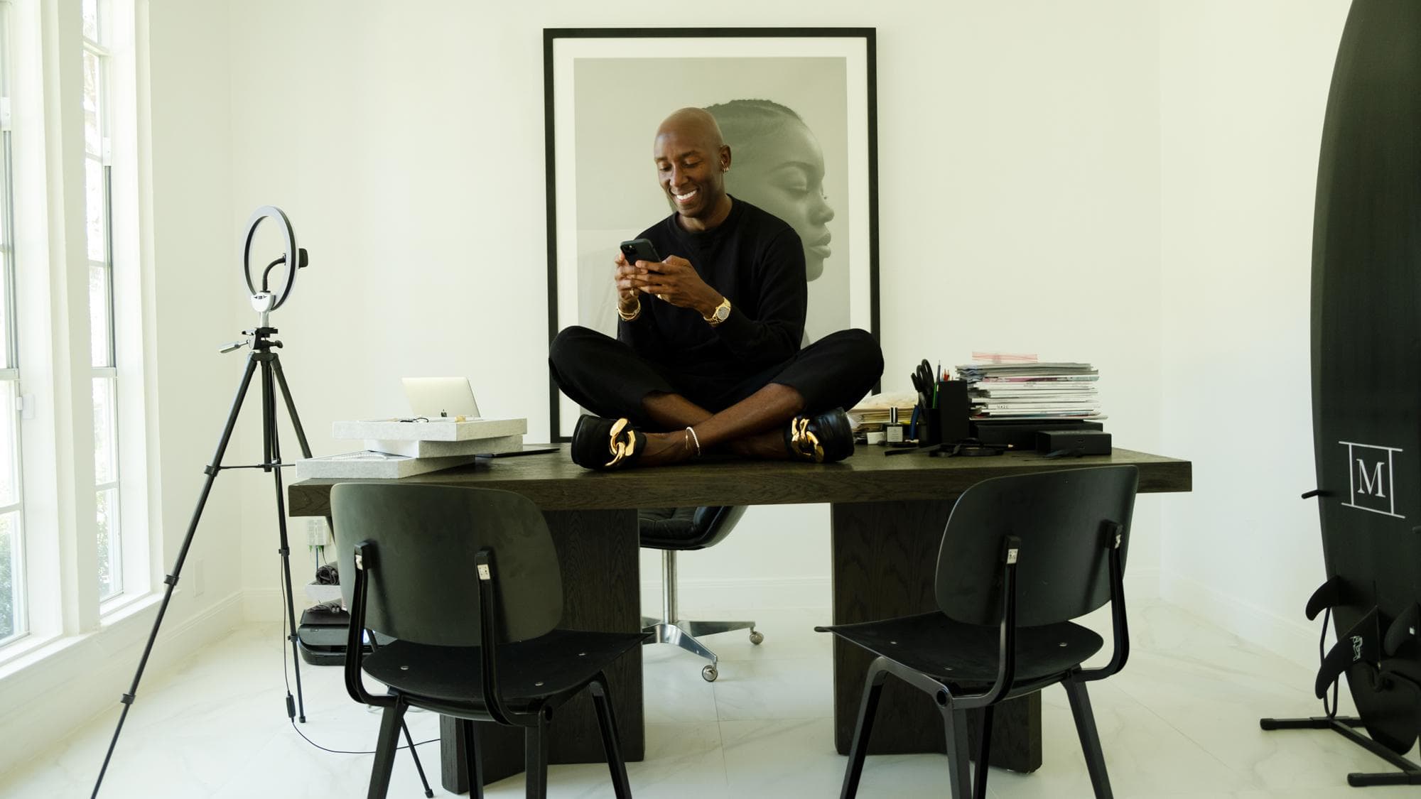 Cross the threshold of jewelry designer Matthew (Mateo) Harris' newly renovated Houston home and you might wonder if you are, in fact, in a home or if you have stumbled upon a serene art gallery in the middle of the bustling Texas city. Each item in the space doubles as a piece of art whether it be the spindly Terje Ekstrom chairs, the austere Michael Anastassiades light fixture, or the Faye Toogood Roly Poly stools. “I splurged on furniture and art for sure," the Jamaican-born designer explains. “For me it was important to have pieces that I truly love and would want to cherish. This is my home. I am not going anywhere any time soon it seems, so I must enjoy every facet of it."