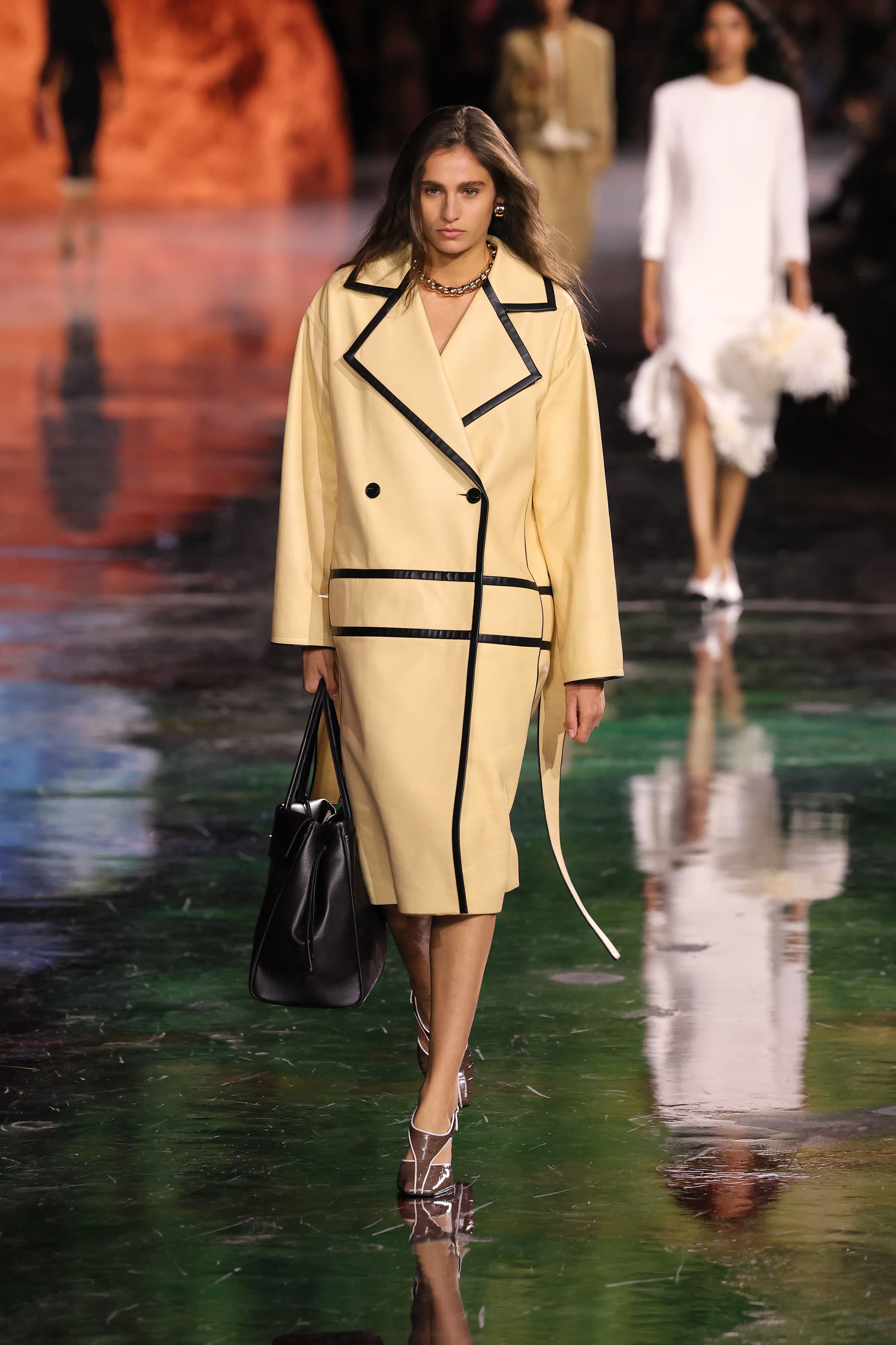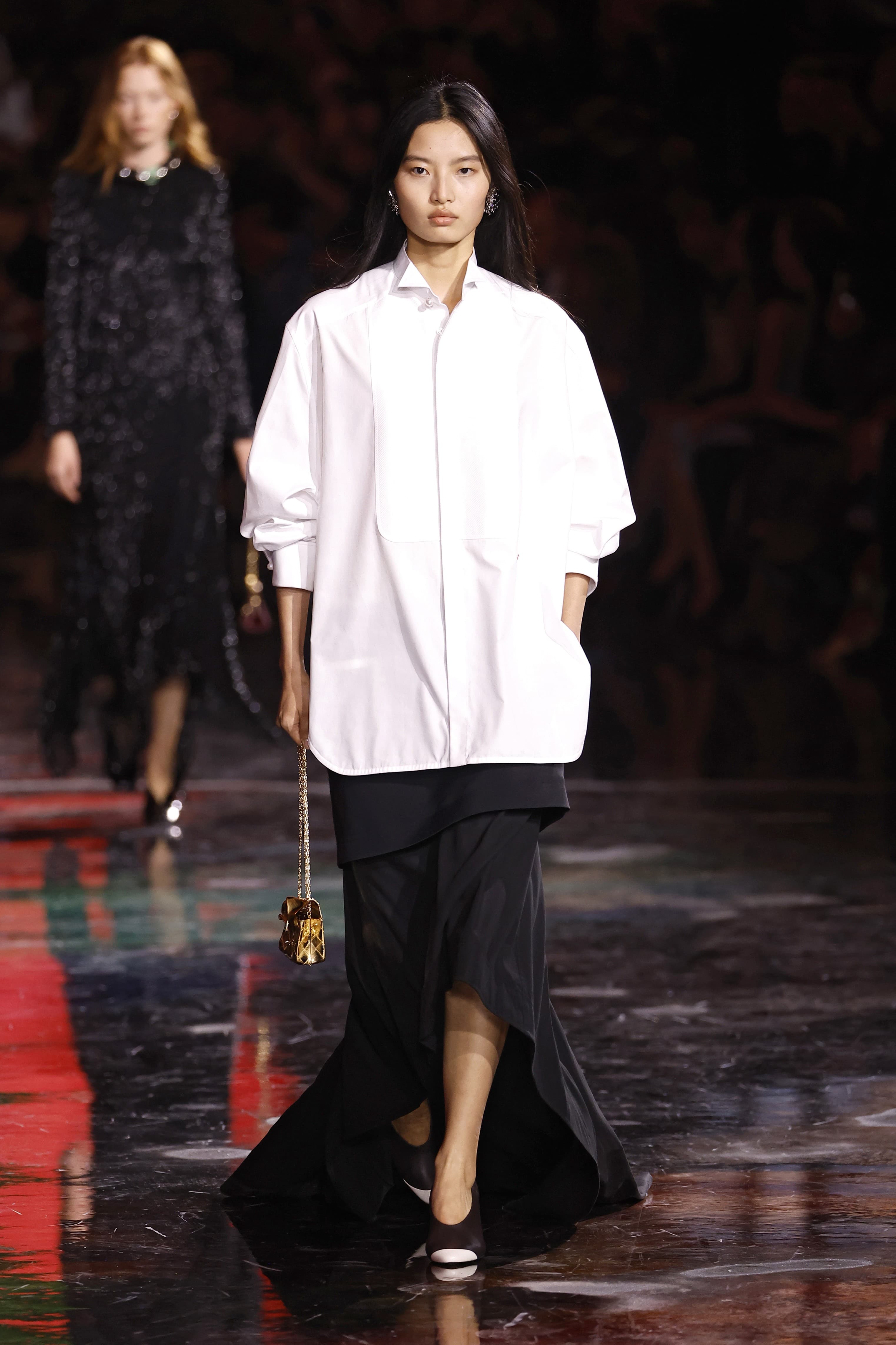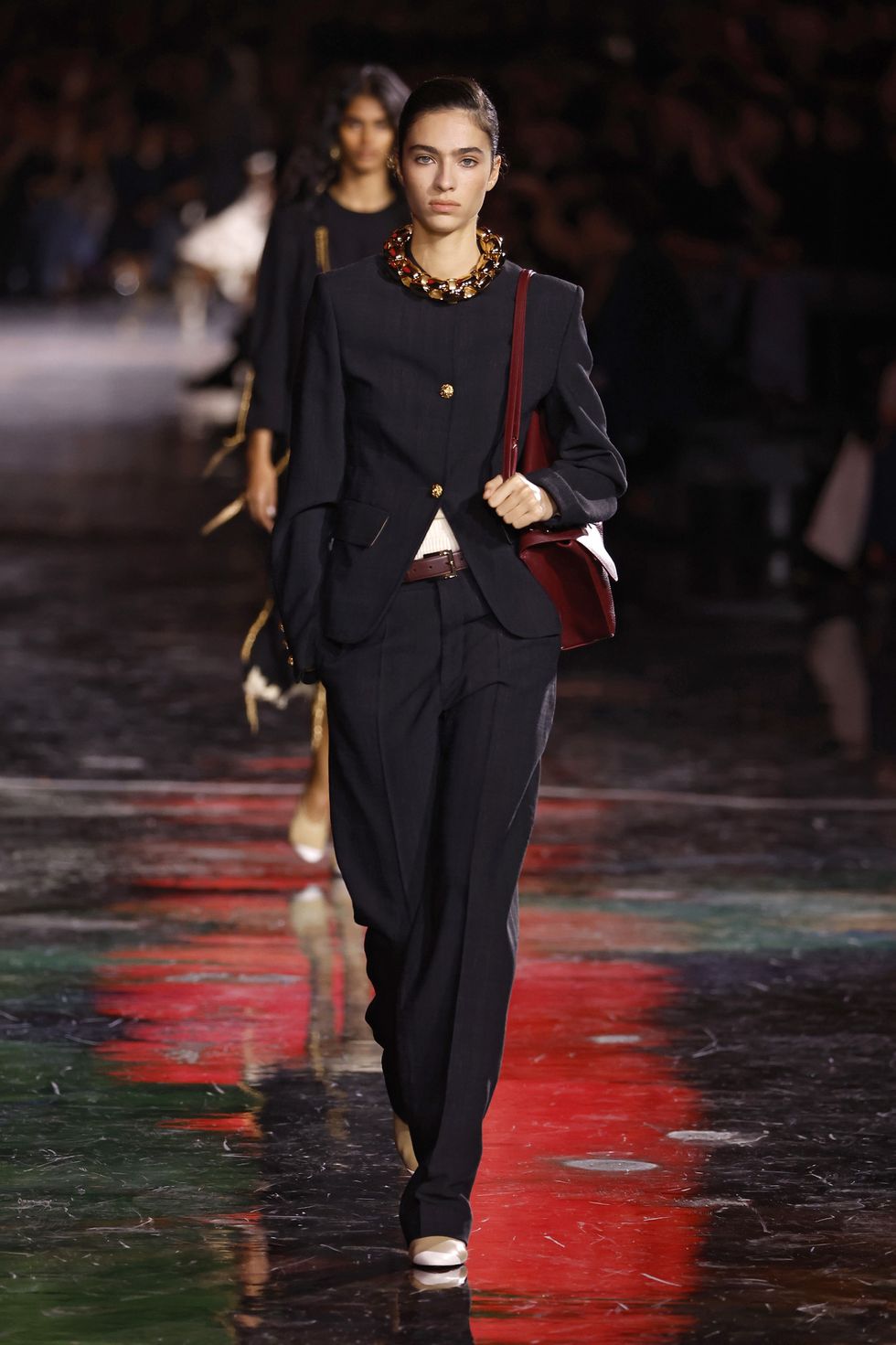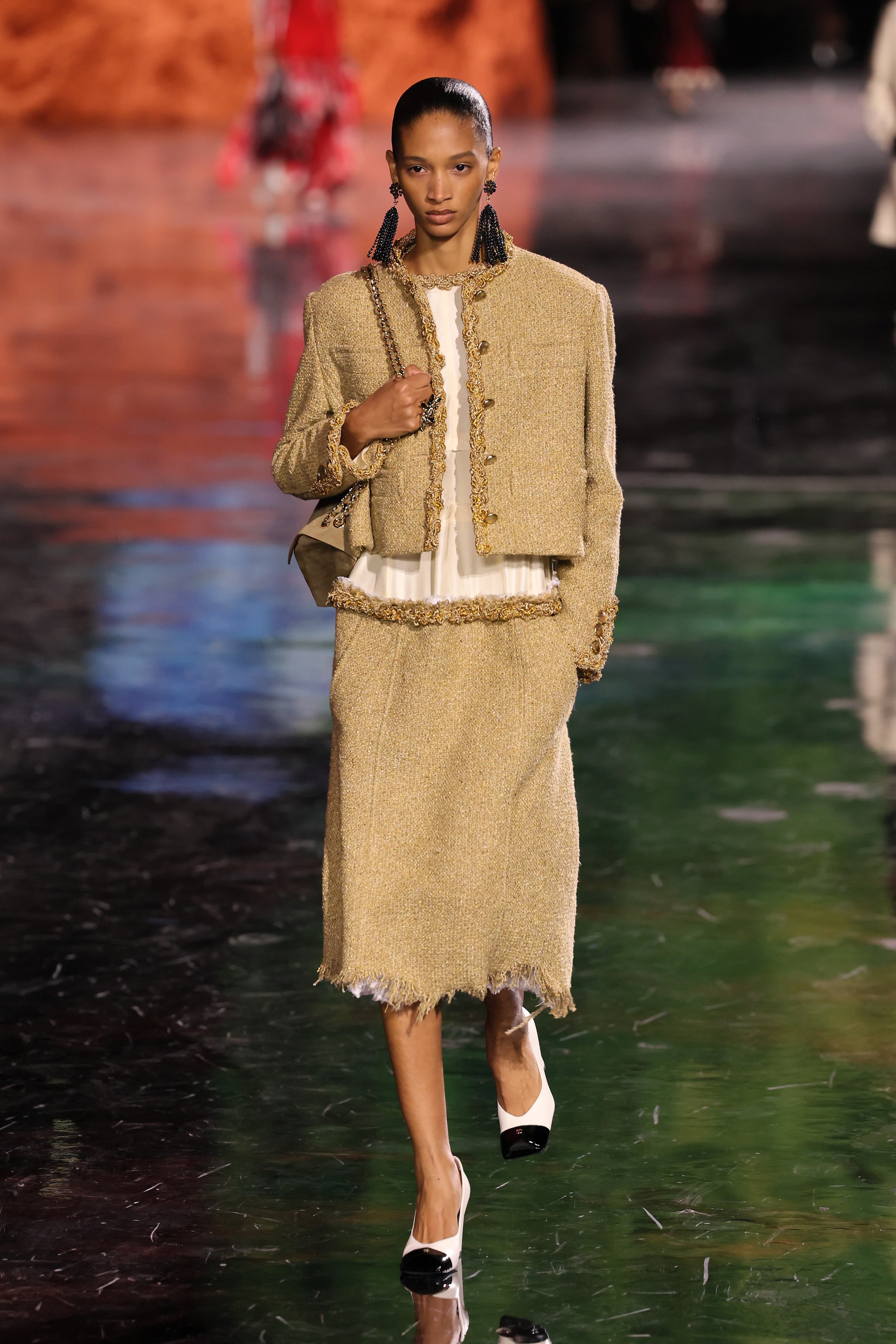 During Virginie Viard’s tenure at the house, the designer would often group a collection of tweed looks together at the beginning before moving into eveningwear. Here, Blazy mixed it all up together. A drop-waist sand colored tweed suit was paired with an oversized suede quilted flap bag and followed by a silk printed gown that was fitted to the body before exploding into watery layers of gathered fabric. His lesson in how to make tweed cool again came via boxy, relaxed shapes, low-rise skirts, and undone jackets that moved with each beat.