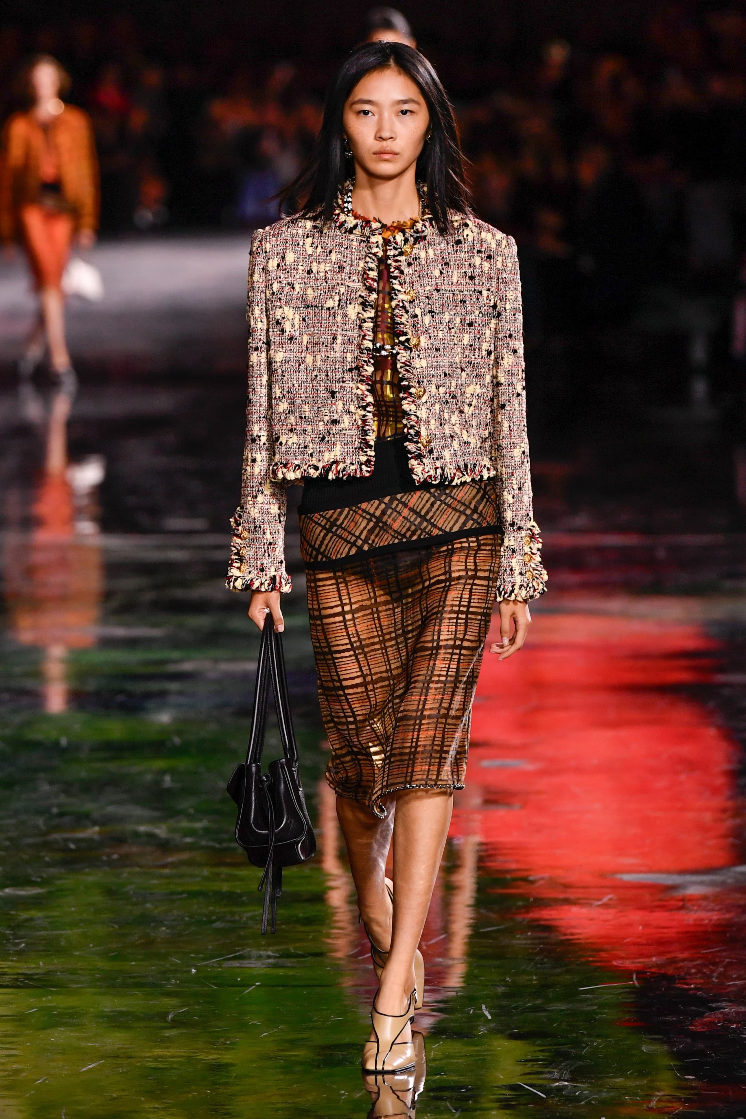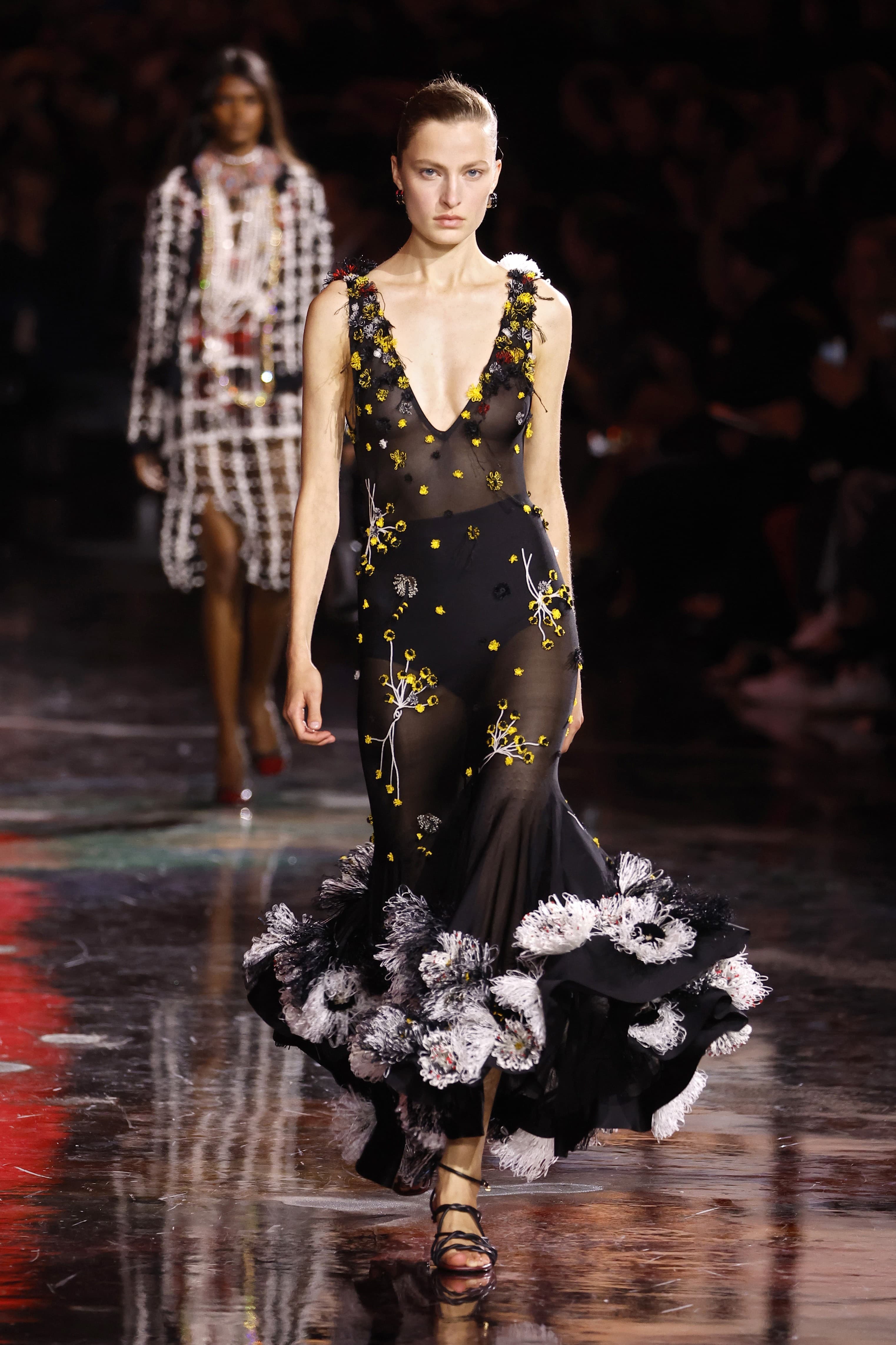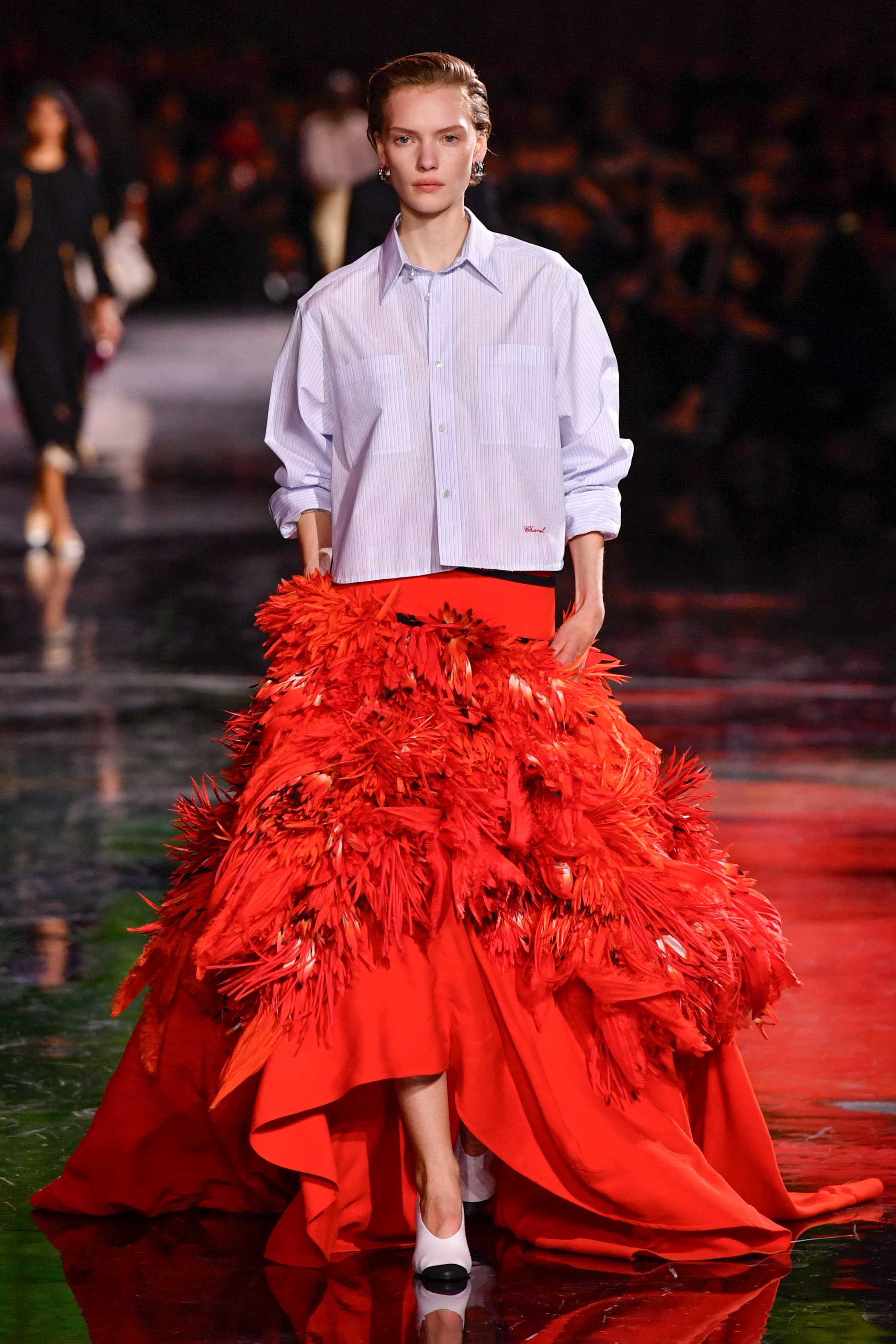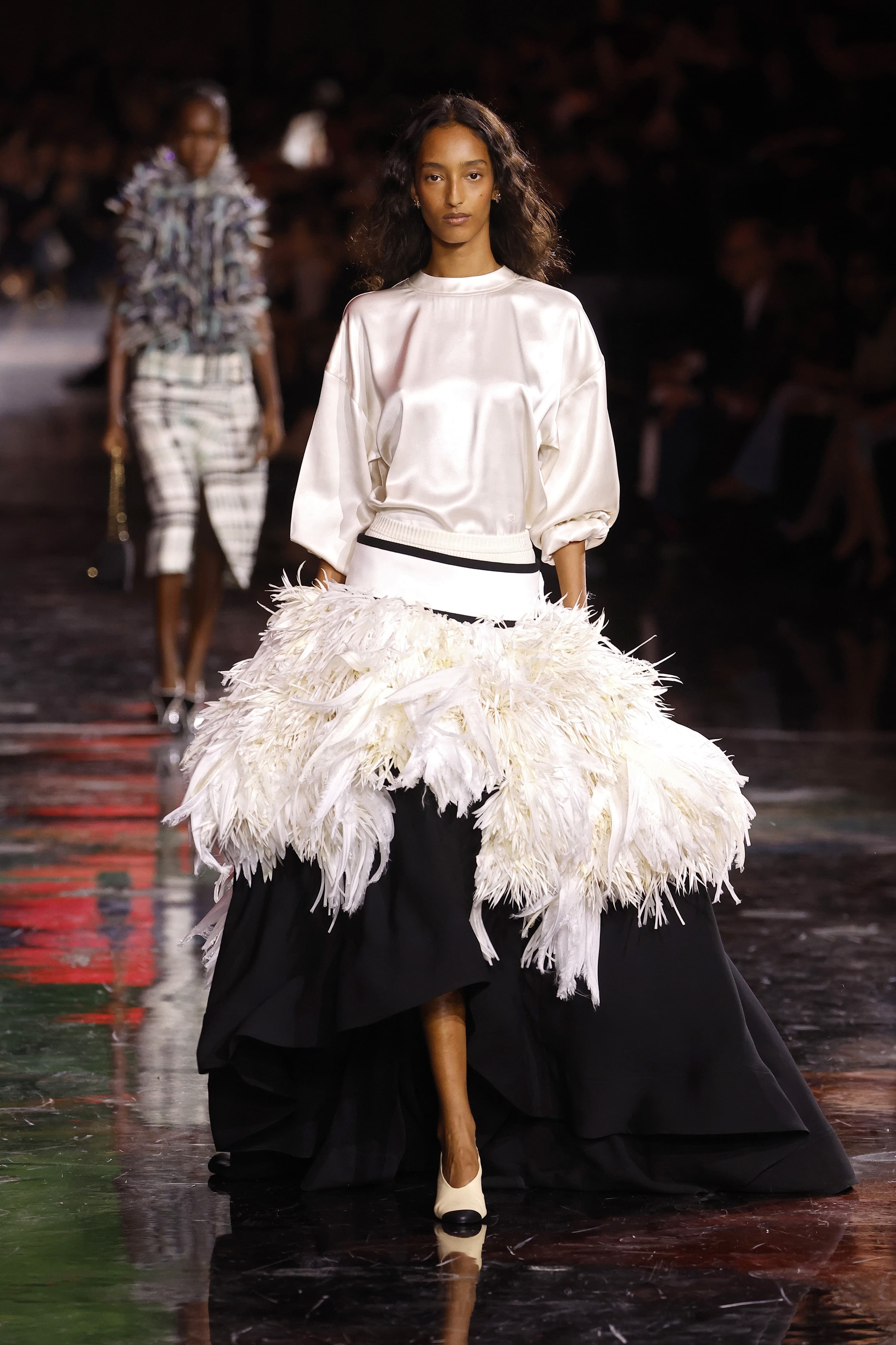 Other notable looks included a silk drop-shouldered t-shirt paired with an enormous black and white skirt that was covered with feathers for volume and impact, a series of transparent tartan pencil skirts styled with tweed jackets cut in Gabrielle Chanel’s signature way, and snug, body-hugging transparent evening dresses featuring embellished necklines and weighty, flippy hems to add maximum movement when models walked.