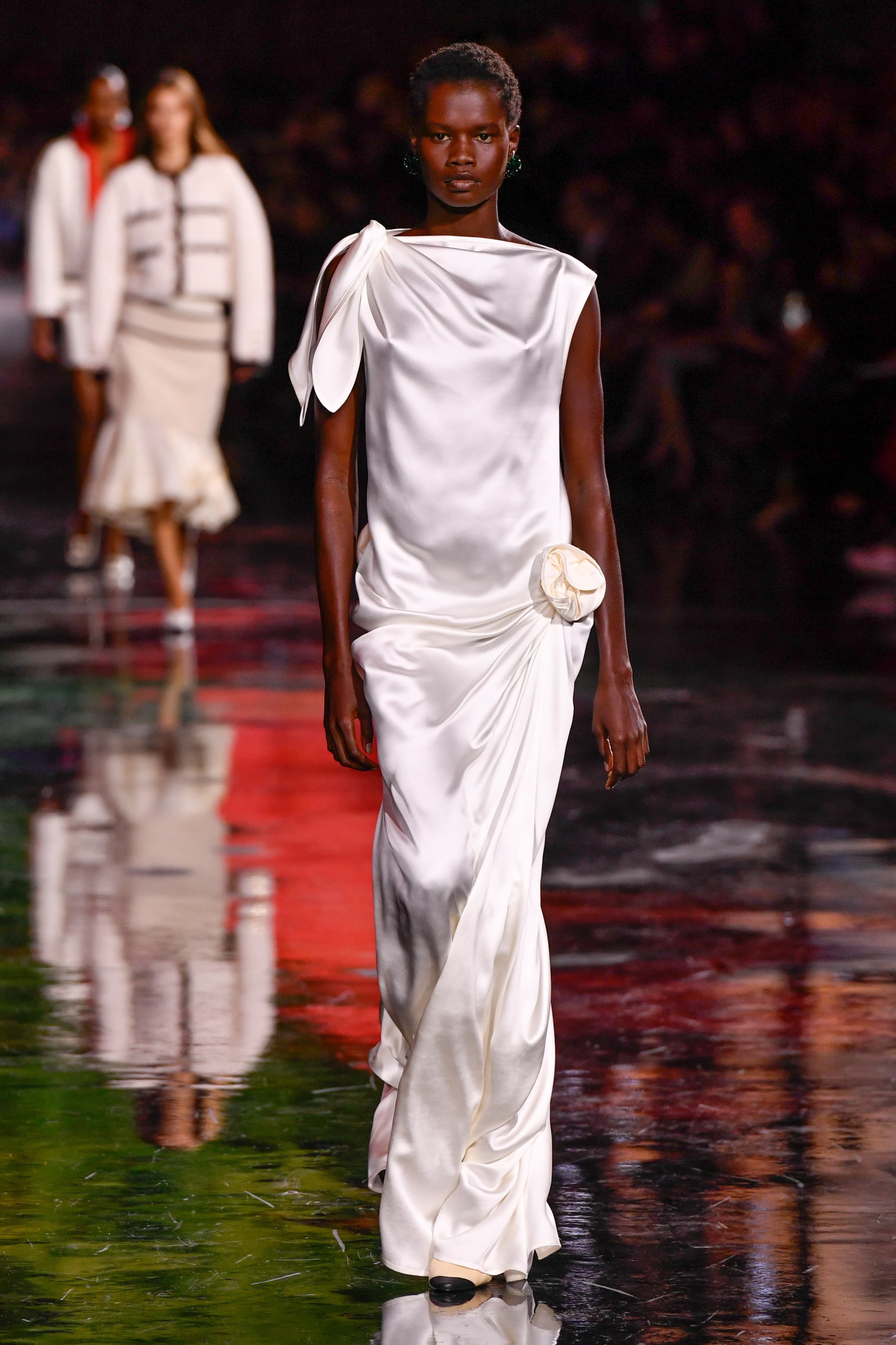 The first few exits were perfectly subdued: cropped wool blazers with cuffed sleeves and low-rise trousers, asymmetric silk skirts with slouchy knit polo shirts and flapper-style embroidered organza tops. Bias cut waterfall skirts in silk were paired with starchy, loose tuxedo shirts and button-downs before a series of ultra-’20s and ultra-Chanel monochromatic skirt suits came down the runway, all white and beige with stark black lines running through the hems and down the middle seams.