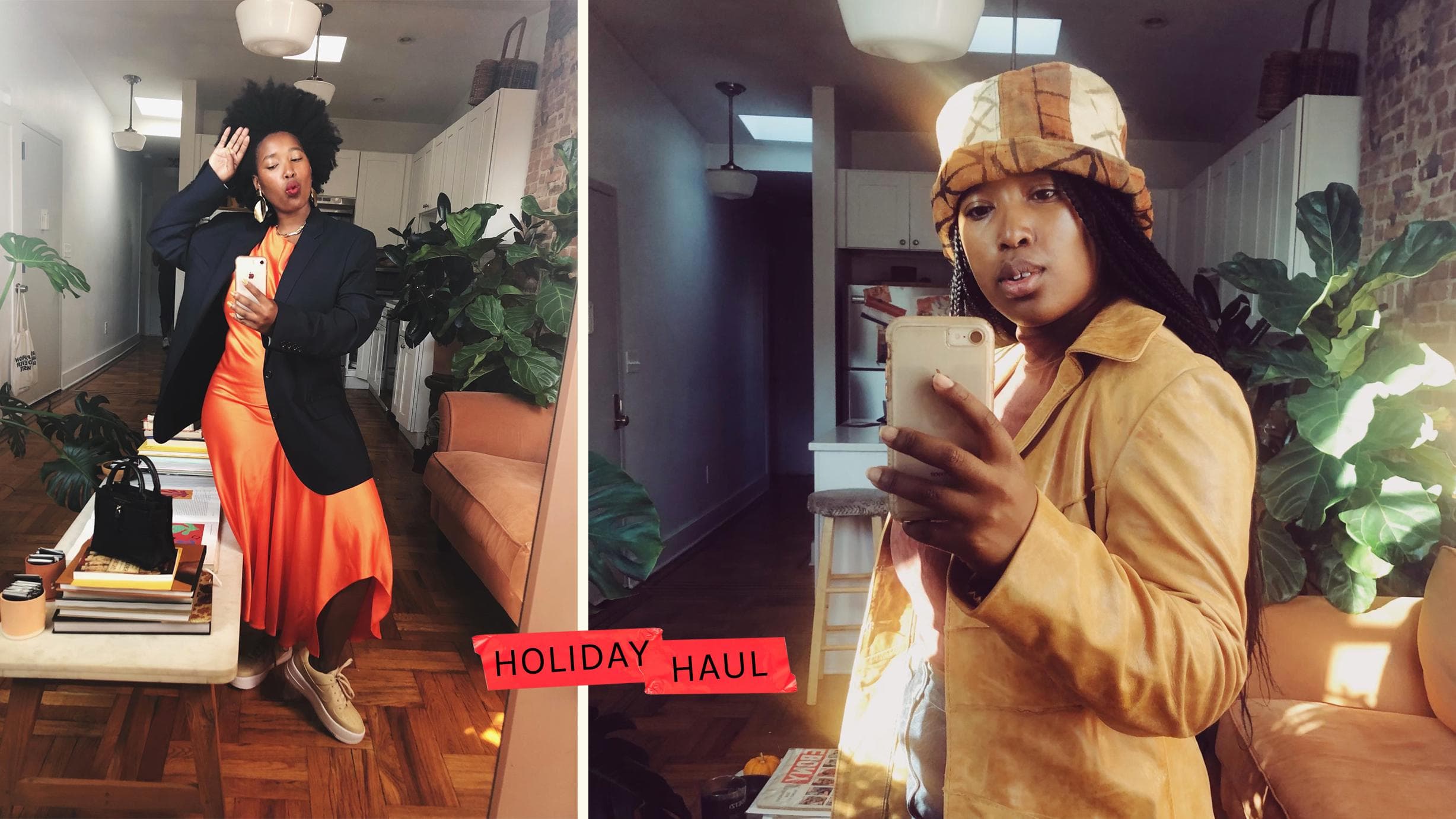 "Holiday and celebratory style for me is keeping it chill; I love sweats during the day and a fancy outfit at night going out in the town. Warmth is definitely essential in all my looks. I also love to pop a red lip gloss for either look to dress them up."