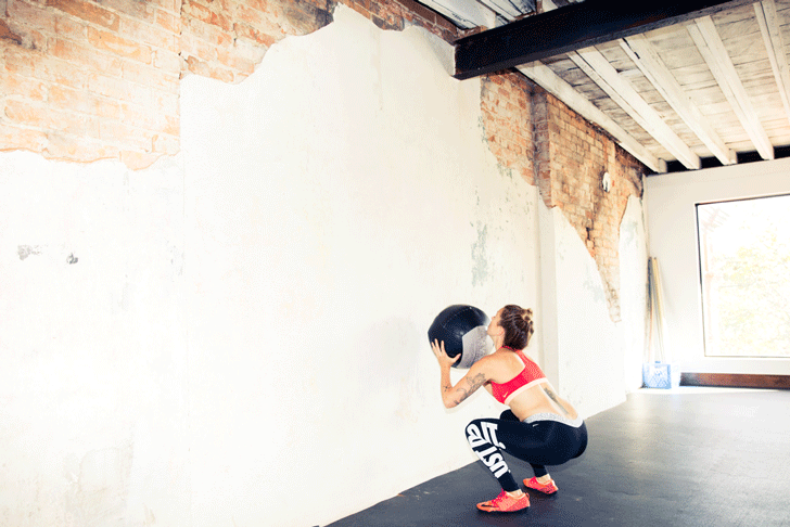 Grab your wall ball (at the appropriate weight for you) and stand approx. 1ft away from the wall. Hold the ball at chest-height with your hands placed on the side of the ball towards the bottom. Next comes the squat portion of the movement. While keeping your shoulders back, chest high and feet shoulder-width apart, move into a full squat. Immediately upon reaching your full squat, drive through your heels and stand up explosively, using that energy to drive the medicine ball upwards on the wall. Absorb the ball as it rebounds off of the wall and immediately squat down to repeat the previous steps.