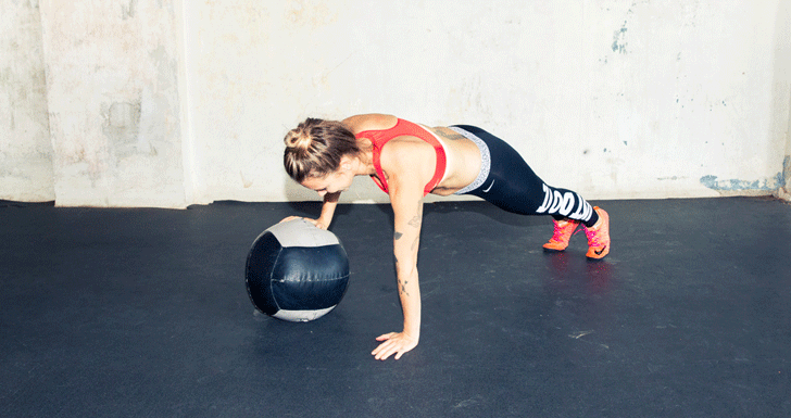 Place a medicine ball nearby and lay on the floor in front of it with your hands on the floor shoulder-width apart in a push-up position. Place the tops of your feet on the medicine ball. At this point your legs should be fully extended and the upper body should be in a push-up position, shoulders directly over top of your wrists. While keeping your back straight and abdominals engaged, pull your knees in towards your chest allowing the ball to roll forward under your ankles. Squeeze your abs and hold that position for a second.Slowly straighten your legs, rolling the ball back to the starting position.