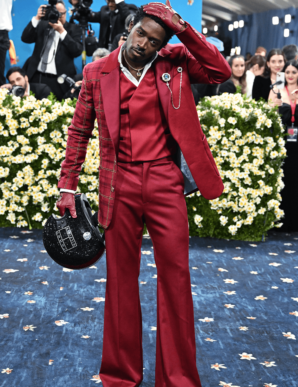 Gilbert Flores/GettyOn the slightly lighter side of the color spectrum, Damson Idris, who arrived in a racing suit and helmet, dramatically revealed a rich red suit on the Met Gala carpet