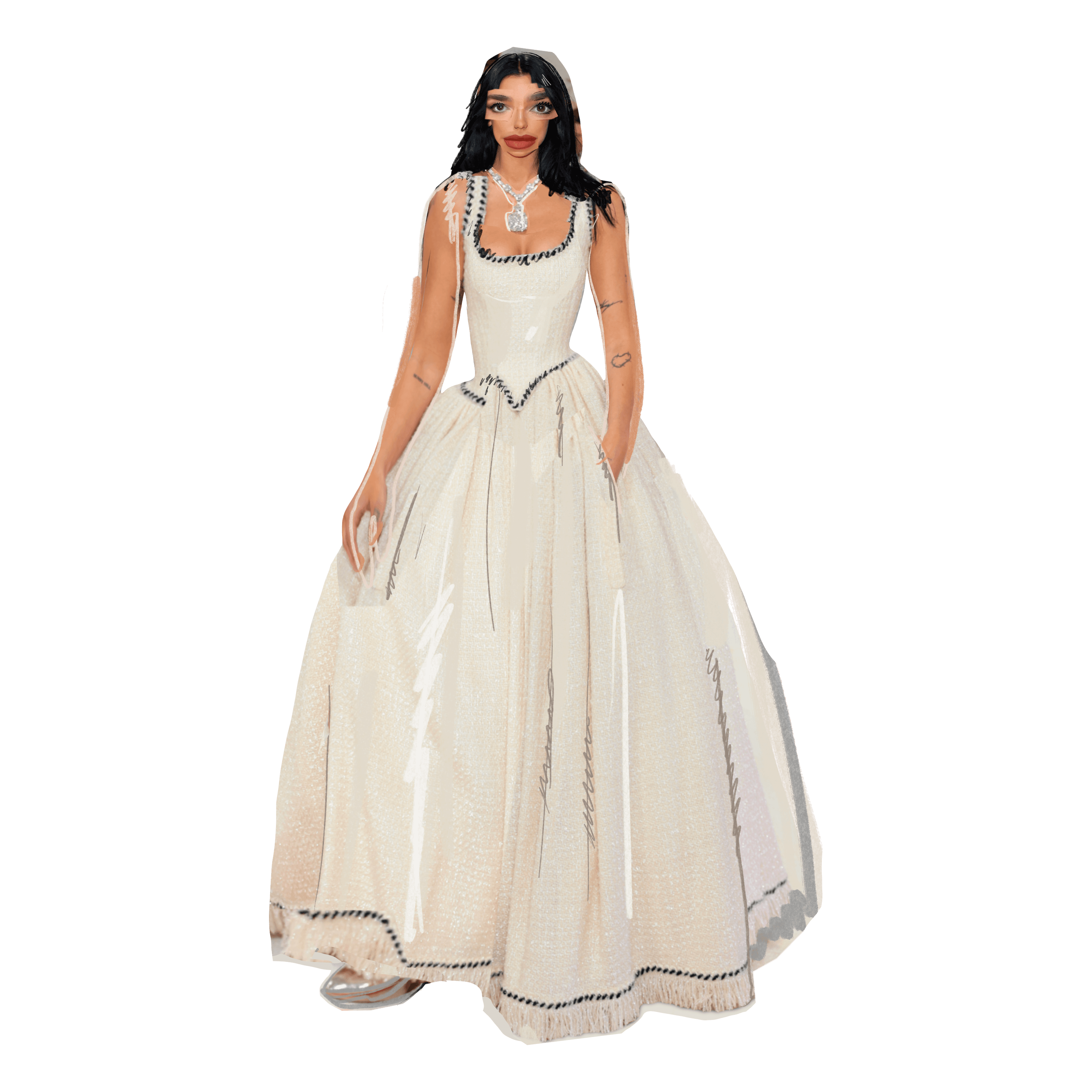 Dua Lipa wears CHANEL and Tiffany & Co.; Art: Austin CallAs one of this year’s co-chairs of tonight’s event, Dua Lipa showed up towards the beginning of the red carpet proceedings and captured everyone’s attention in this tweed CHANEL ball gown—the same look Claudia Schiffer wore in the fall 1992 Haute Couture runway show. Hoop skirt aside, the real star of her look was the jaw-dropping Tiffany & Co. Legacy diamond hanging from her neck, which clocks in at over 100 carats.