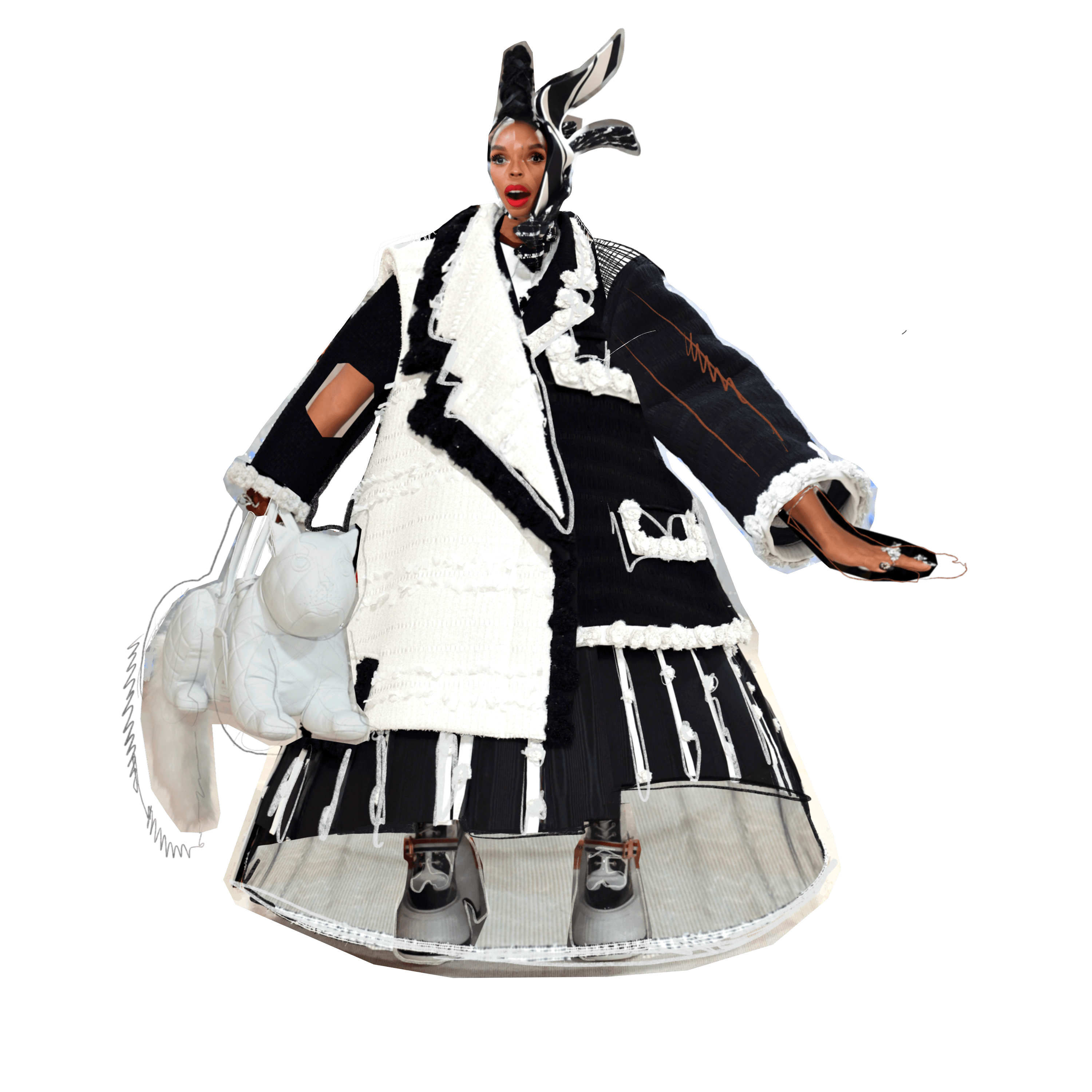 Janelle Monaé wears Thom Browne; Art: Austin CallJanelle Monáe ticked two winning boxes in terms of Met Gala red carpet sartorial opportunities last night. First, they embarked upon a multi-step wardrobe change in the middle of the carpet. Second, they wore Thom Browne—a near-sure coup in our eyes. The star began her ascent in a two-toned tweed Lagerfeld-ian coat which she then shed (with the help of a kind attendant) to reveal a starchy white button-down, then a sheer hoop dress and glittering string bikini. They accessorized with a Choupette-style handbag in lieu of Browne’s signature dog.
