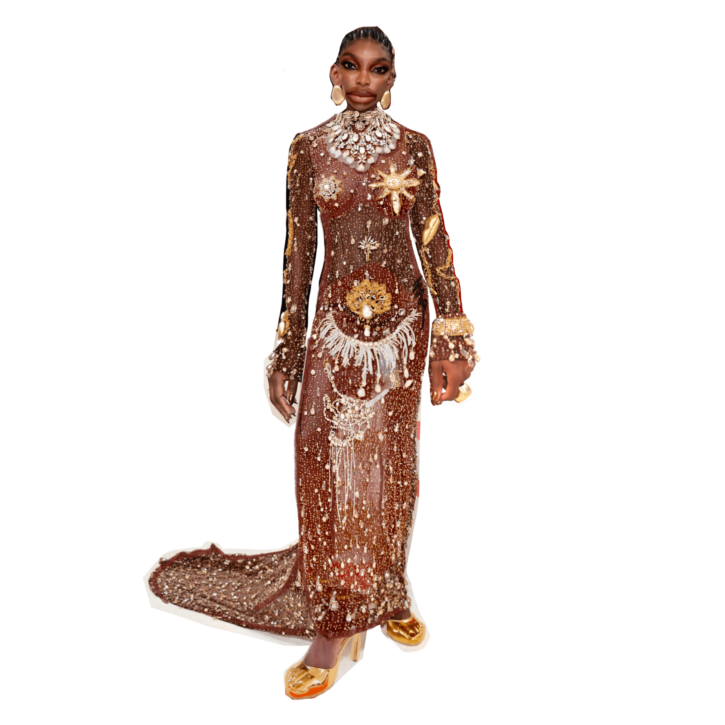 Michaela Coel wears in Schiaparelli; Art: Austin CallAnother co-chair of the event, Michaela Coel, stunned in a sheer custom Schiaparelli Haute Couture number last night (yet another page in the Met Gala’s fascinating naked dress history). The tulle dress features over 135,000 crystal beads and 26,500 mixed stones. The whole thing took a mere 3,800 hours of hand embroidery work and it shows. The trompe l’oeil jewelry (in different shades of gold and translucent topaz) was inspired by Lagerfeld’s infamous costume jewelry, without divorcing Daniel Rosenberry’s sartorial kink for human anatomy.